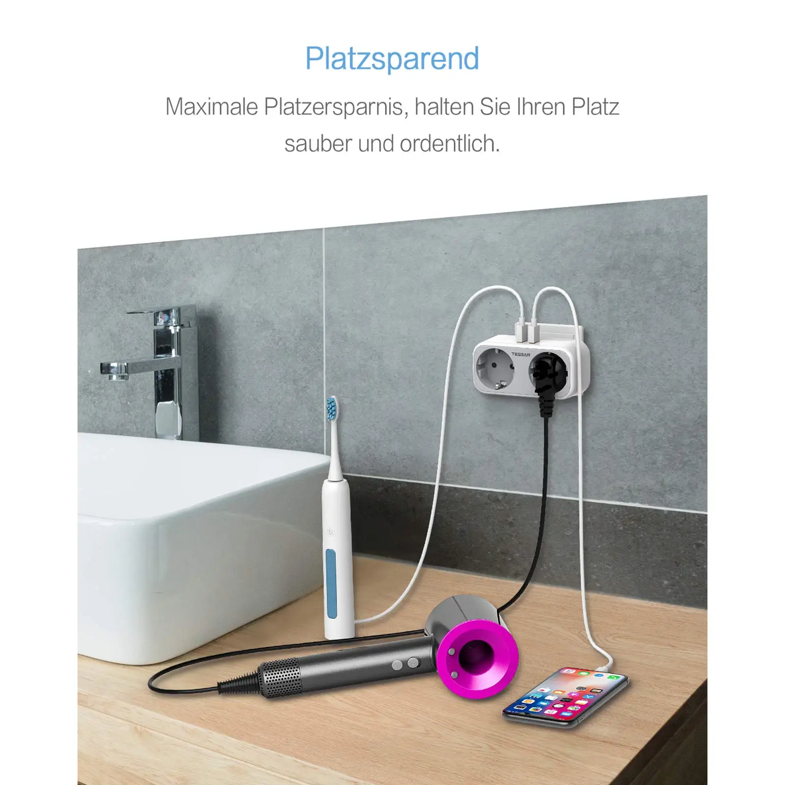Несколько настенных розеток можно использовать в любом помещении, например в спальне, ванной, кухне, офисе и т. д., несколько приборов могут работать одновременно, кабели не загромождают.