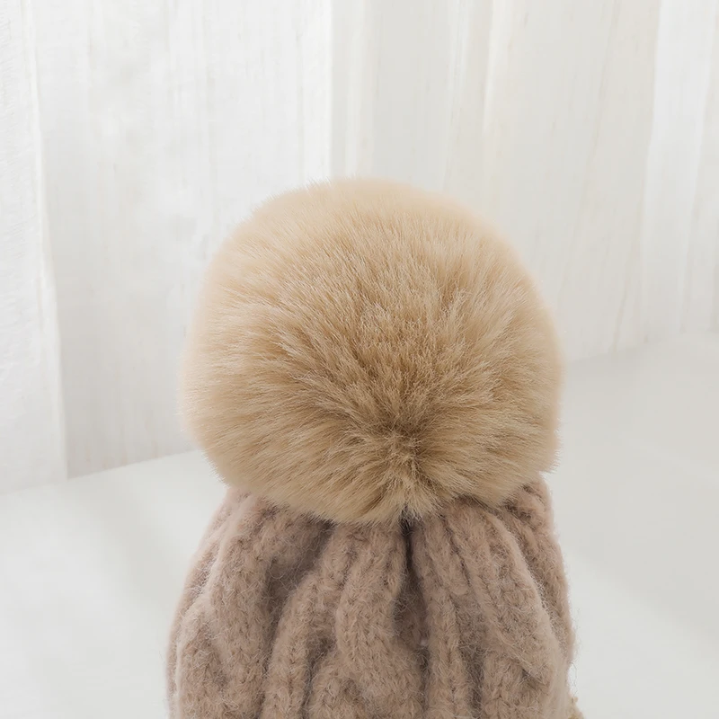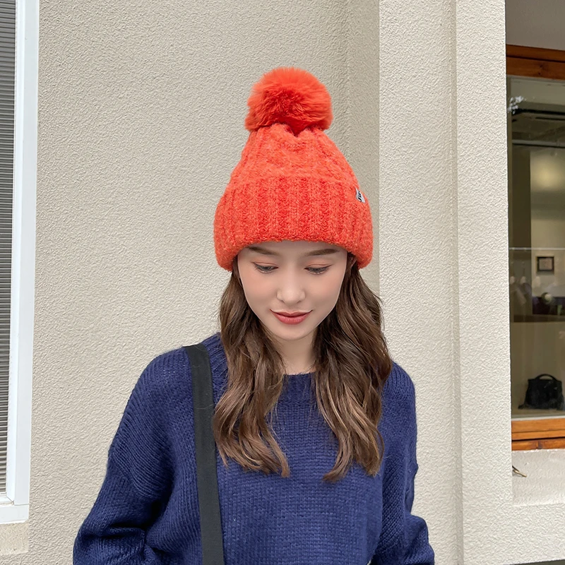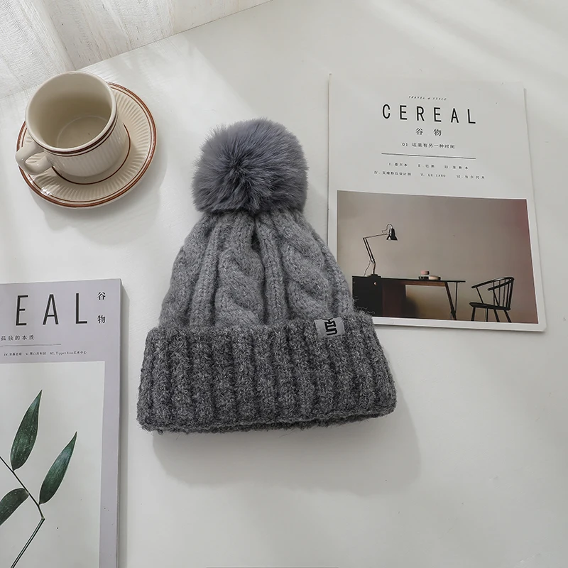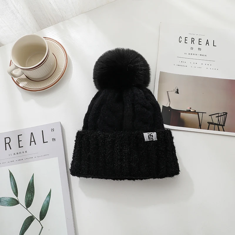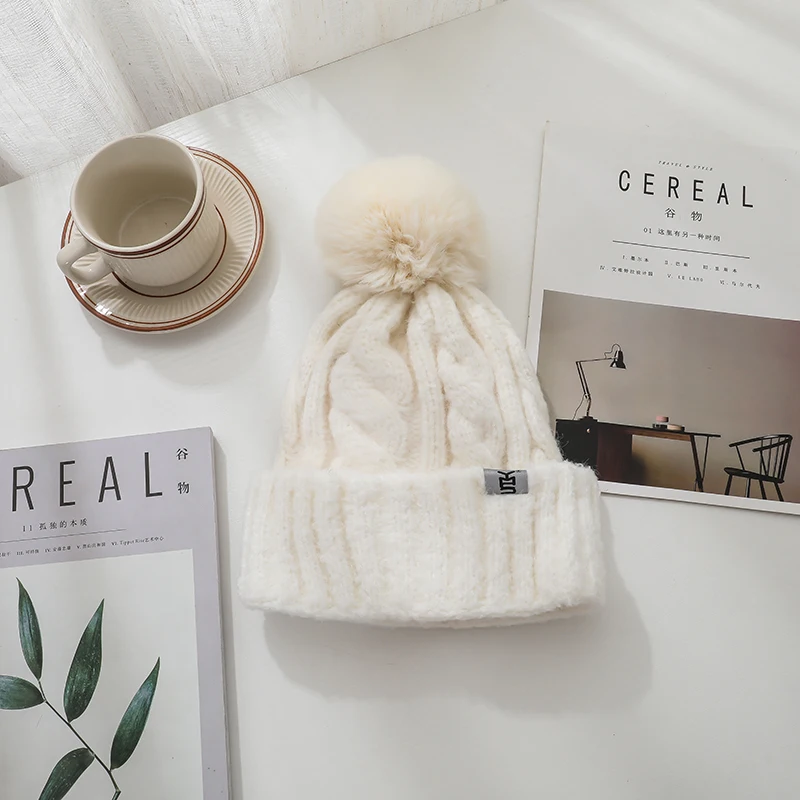 Features: knitted hat, pompon, plush inner liner, keep warm