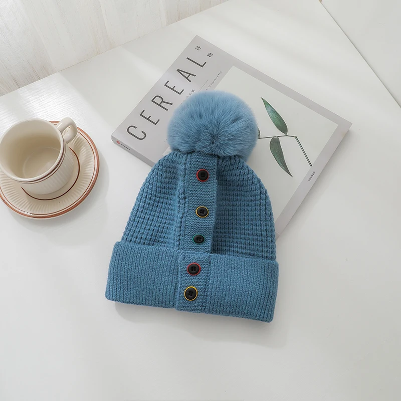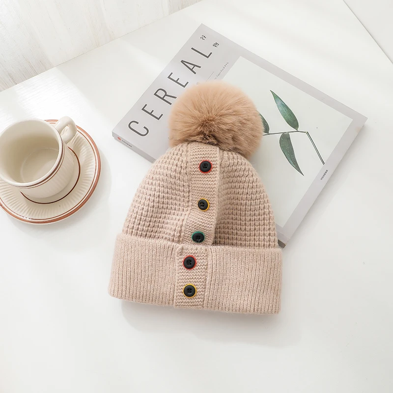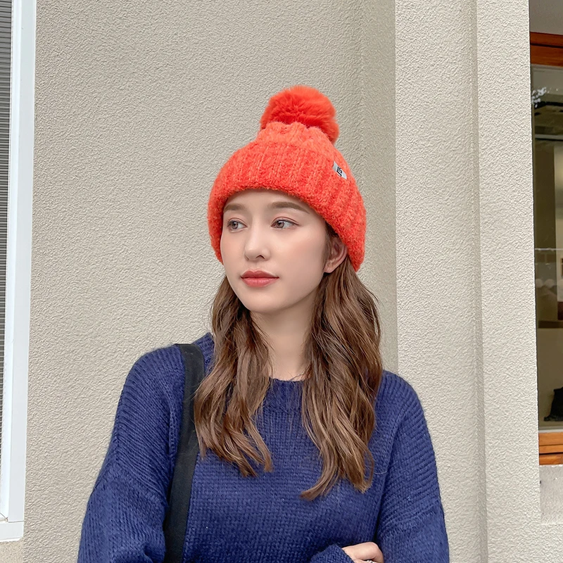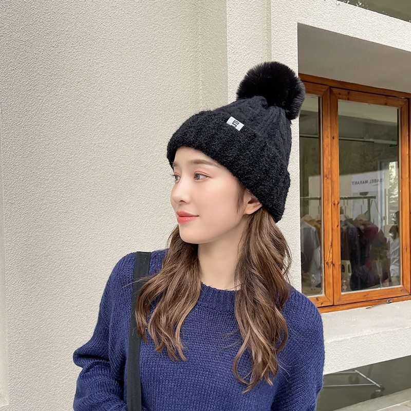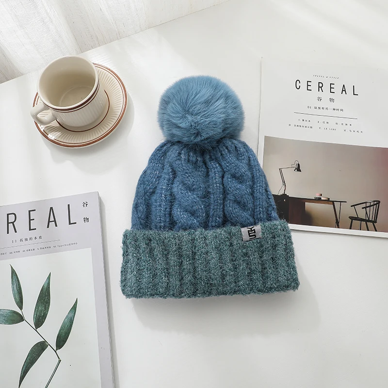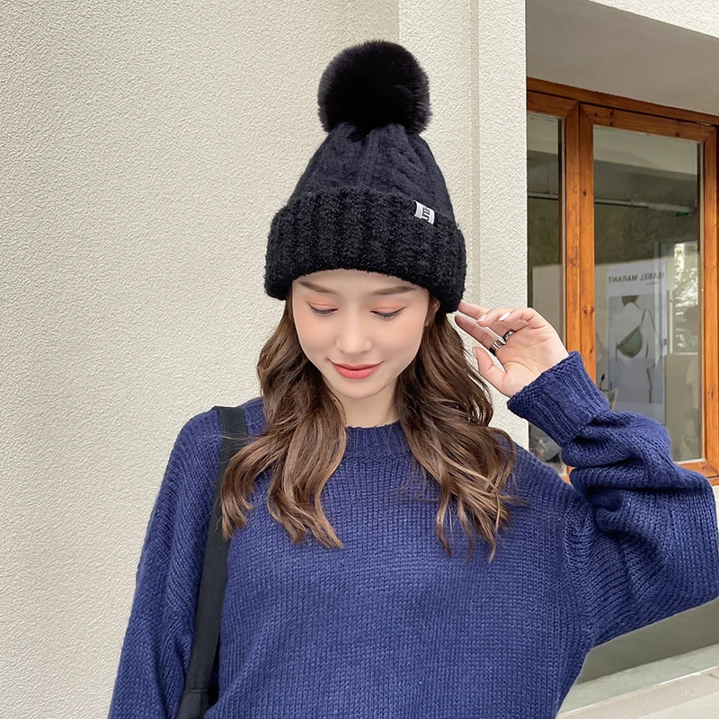 Features: knitted hat, pompon, plush inner liner, keep warm