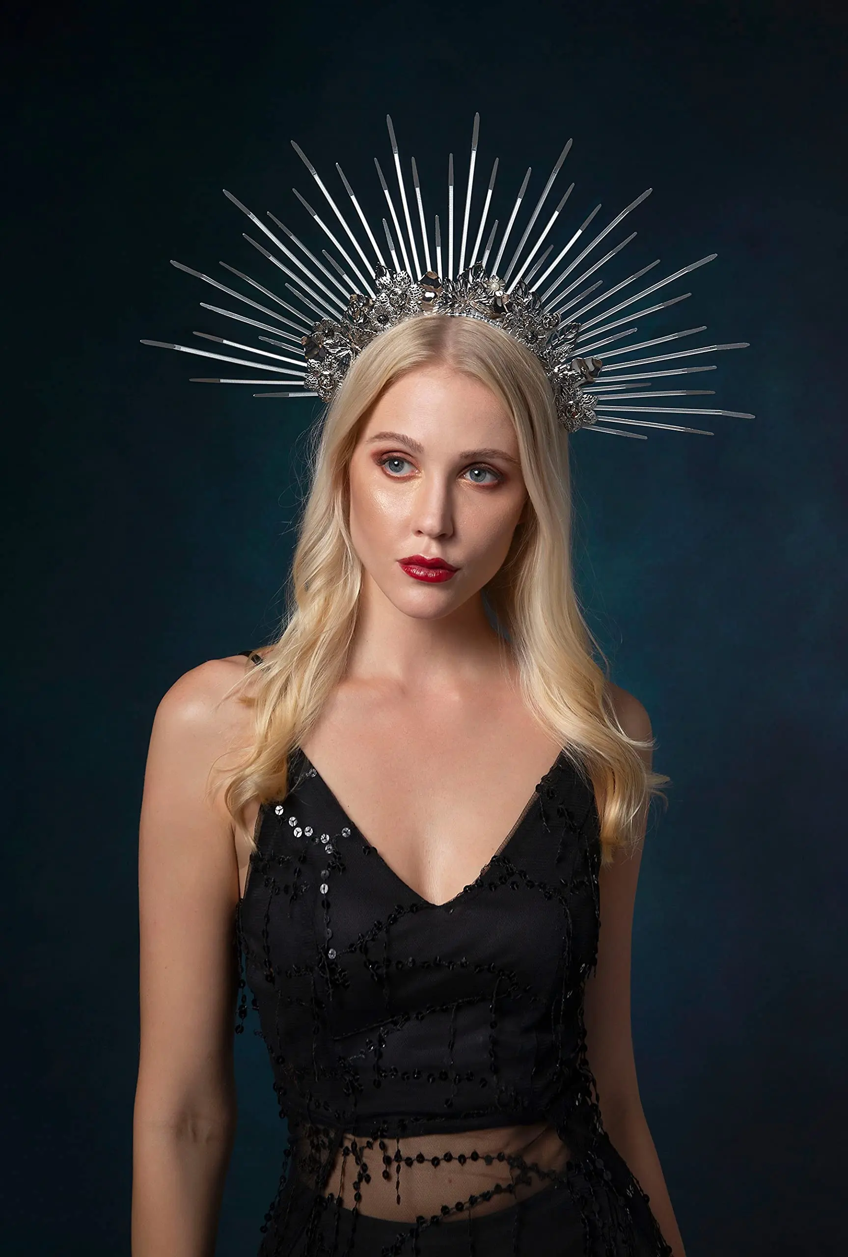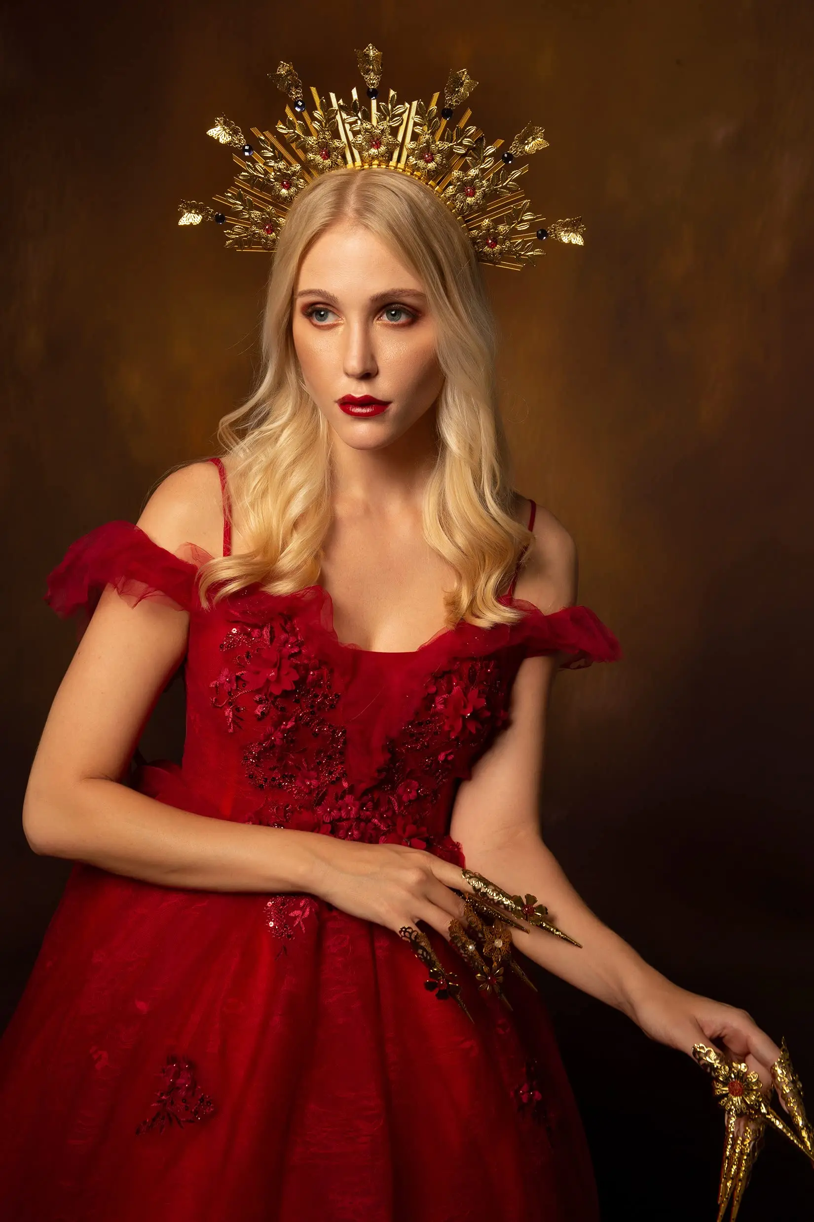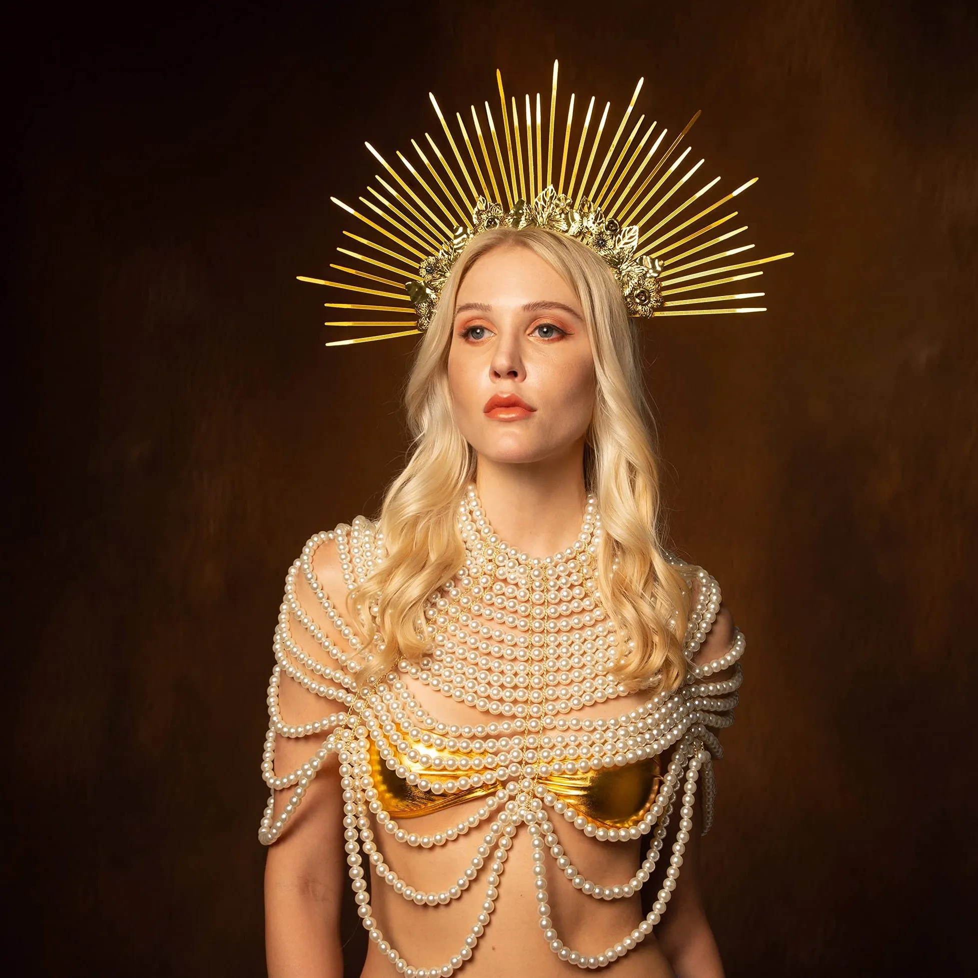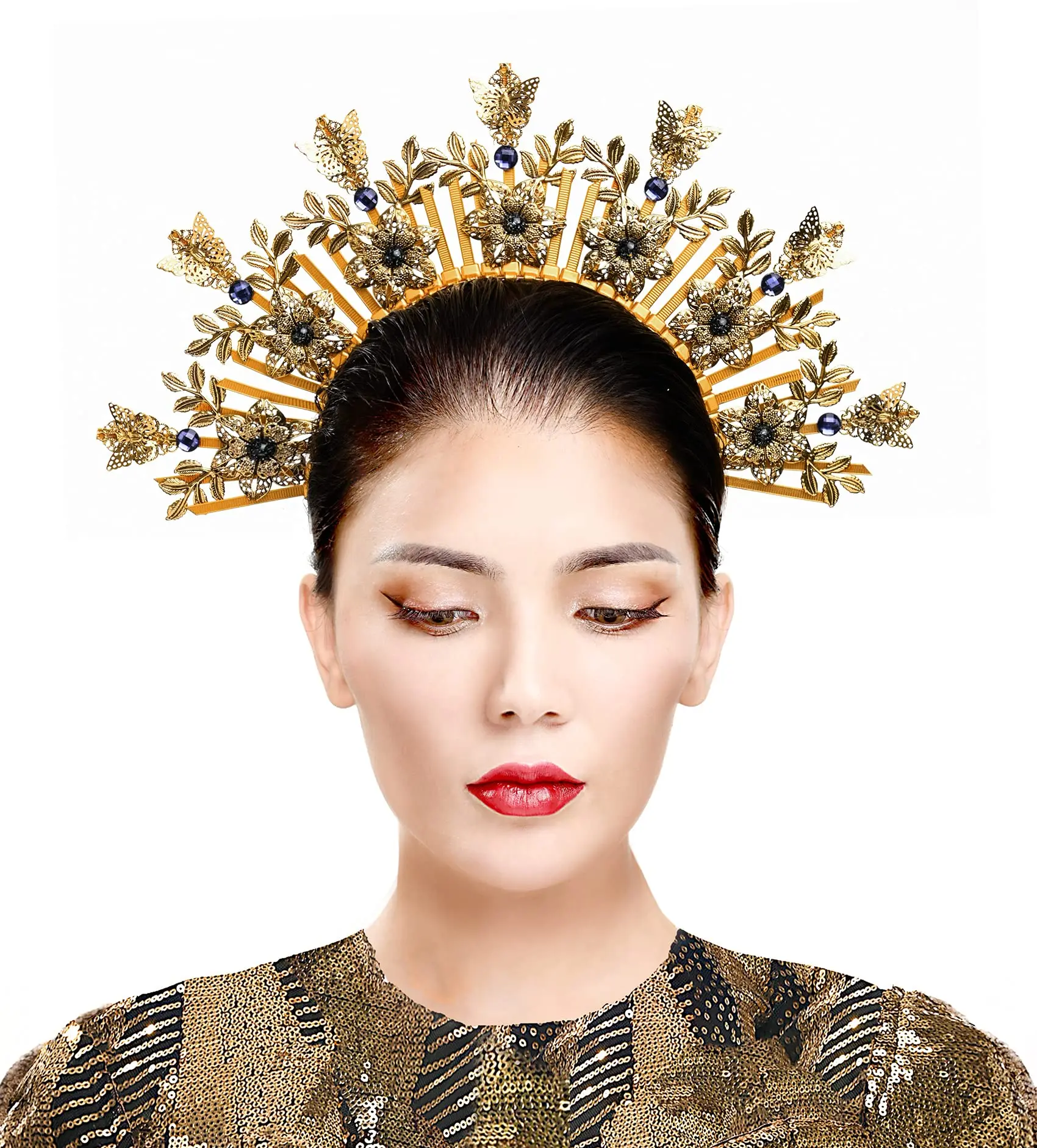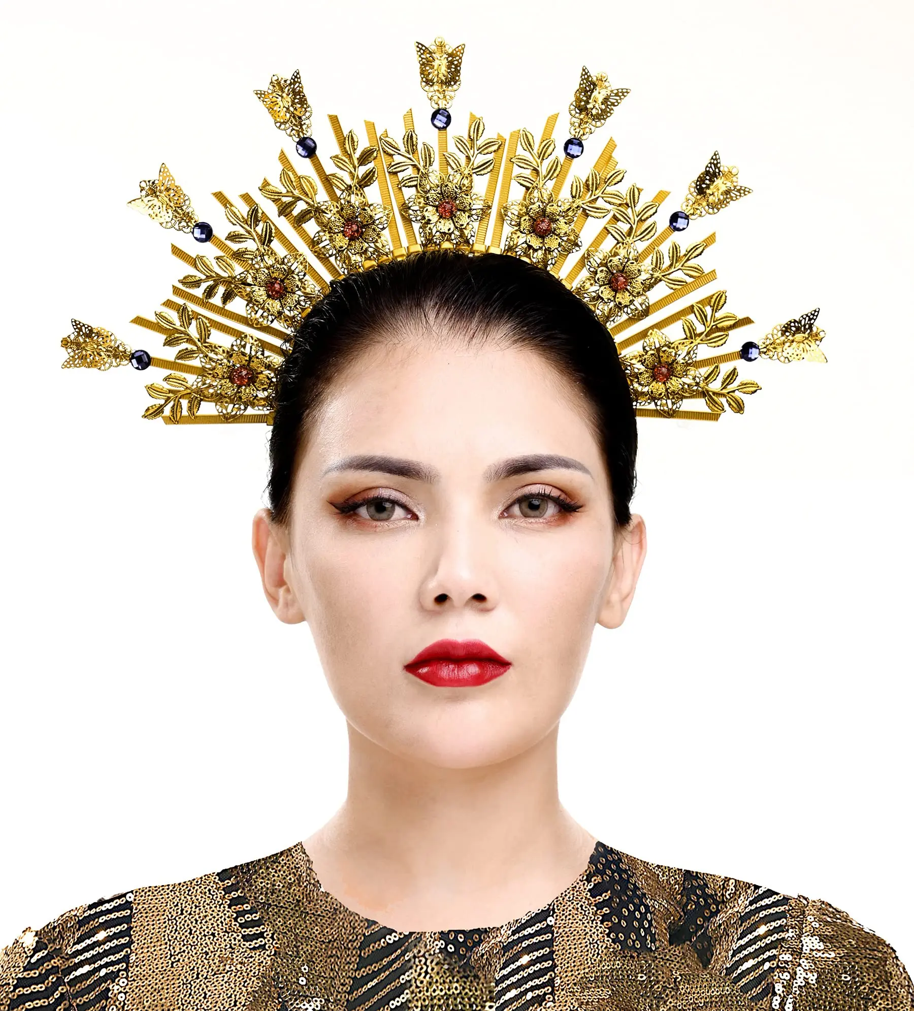 Золотой обруч Корона Шипованная богиня головной убор Sunburst тиара Цветок головная повязка Свадебная фотосессия аксессуары для волос для Хэллоуина