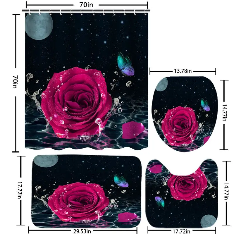 (Занавеска для душа + прямоугольный коврик + u-образный коврик для унитаза + чехол для унитаза + 12 крючков)
