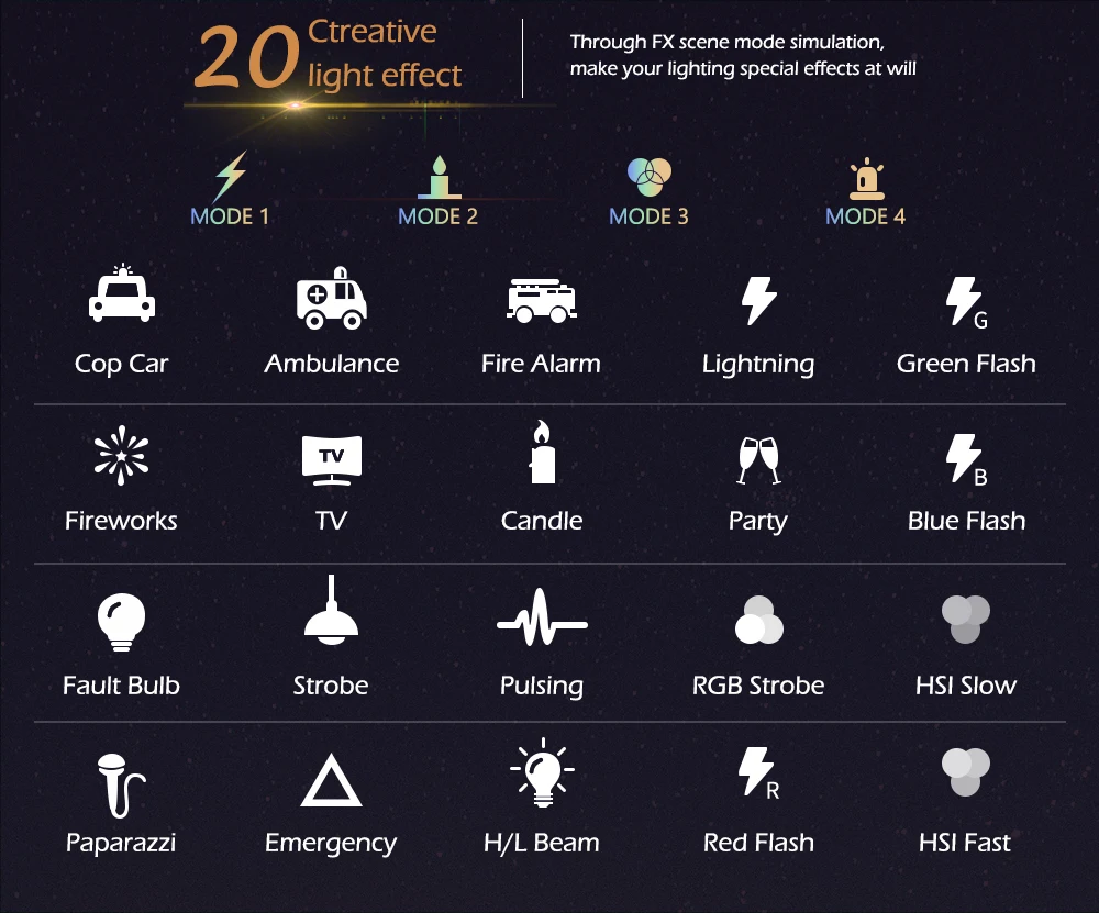 【HSI/цветовая температура/сцены светильник ing modes: красный, зеленый и синий видео светильник позволяет вам быть более гибкими в вашем кино, обеспечивая множественные светильник ing режима в соответствии с вашими потребностями. В дополнение к цветовому режиму HSI RGB позволяет настроить белый светильник в режиме CCT или использовать режим сцен. Световые эффекты включают: полицейский автомобиль, скорая помощь, пожарная машина, молния, фейерверк, телевизор, свечи, вечерние, лампы неисправности, пульсирование, стробоскоп, RGB Стробоскоп, Paparazzi, аварийная ситуация, H/L луч, красный/зеленый/синий вспышка, HSI медленно/быстро.