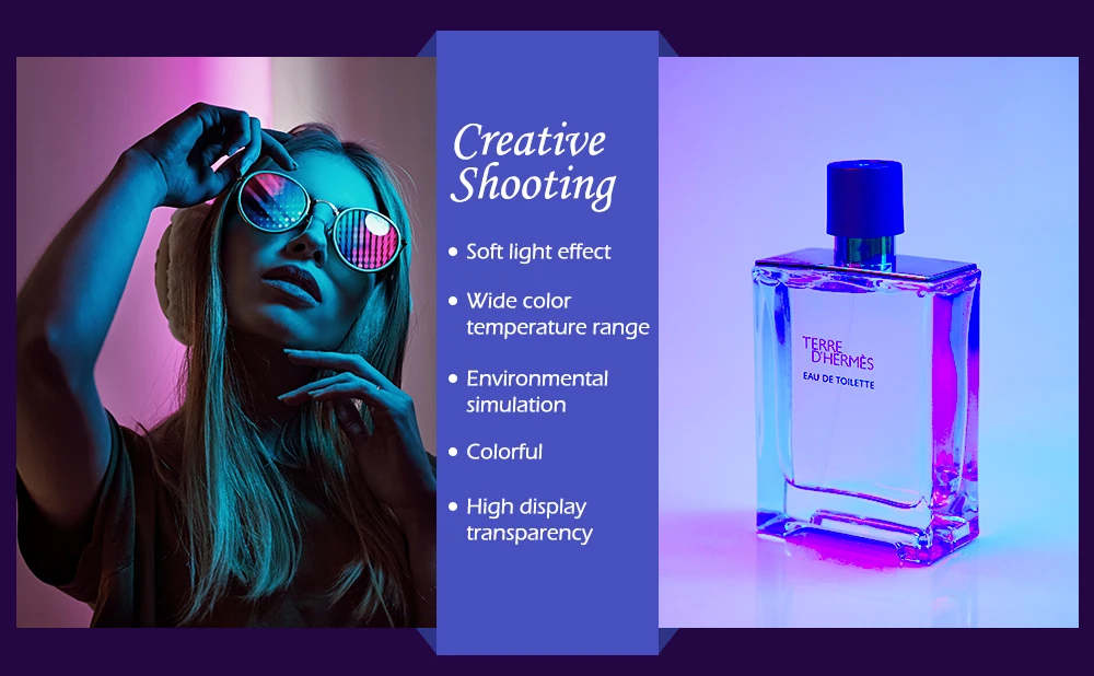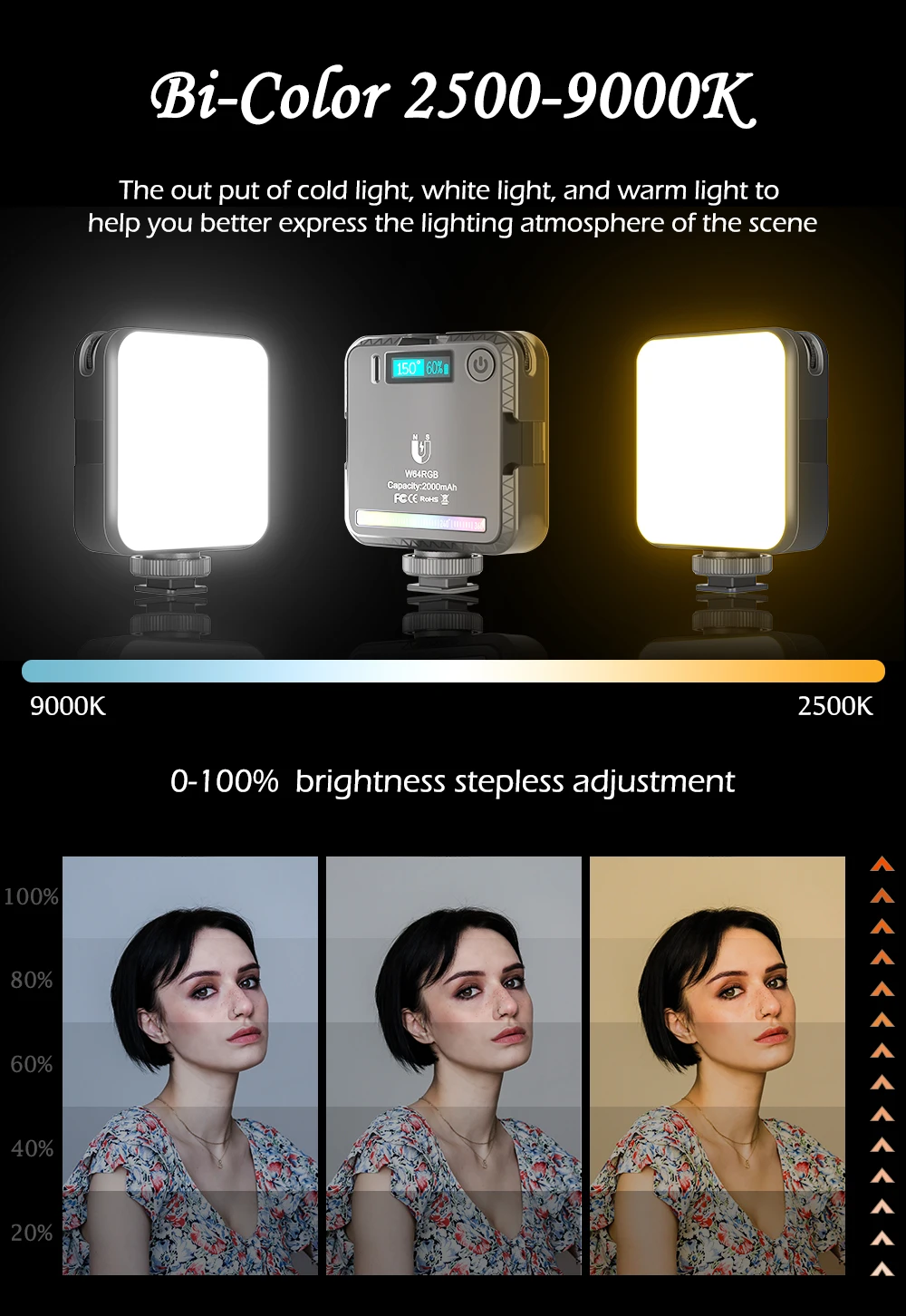 【Полноцветный RGB видео светильник 】: RGB светодиодный видео светильник принимает 73 лампы. Полный цвет RGB 0-120 ° и регулировка насыщенности цвета, Контроль цветовой температуры 2500-9000K, Яркость затемнения от 0 до 100%. 20 видов эффектов на светильник, переключатель с одним ключом.
