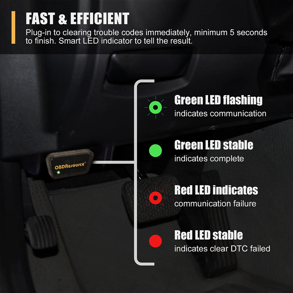 Подключи и работай: один шаг, чтобы очистить коды неисправностей и выключить контрольный светильник двигателя. Больше нет смартфона, больше obd2 сканера, больше никаких утомительных шагов. Простая операция, даже старая бабушка может использовать его с легкостью.
