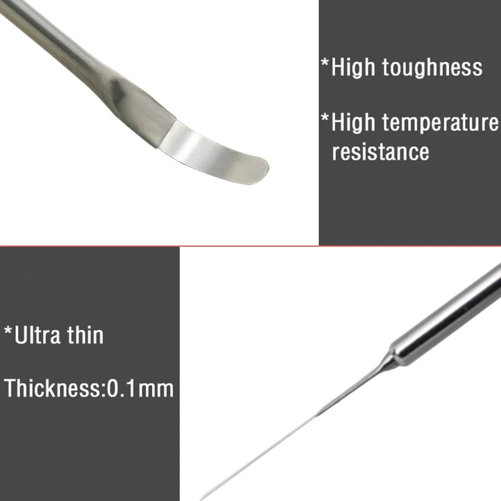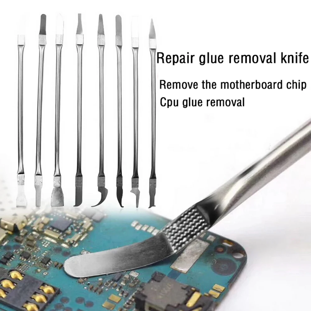 Длина: прибл. 174 мм Цвет: серебристый Материал: нержавеющая сталь Количество: 8 шт./компл. Посылка: 8 шт/комплект CPU IC клей для удаления Особенности: -Функция: предназначен для ремонта сотового телефона BGA и инструмента для очистки клея. -Легко носить с собой: профессиональный и практичный, компактный и портативный для удобного хранения и переноски. -Применение: для ремонта BGA, демонтажа чипа процессора телефона и ремонта телефона .. -Высокое качество: изготовлен из нержавеющей стали, прочный и долговечный. Примечания: 1. Пожалуйста, учитывайте разницу в 1-3 мм из-за ручного измерения, спасибо за понимание! 2. Из-за разницы между различными мониторами, пожалуйста, поймите, что изображение может не отражать фактический цвет товара.