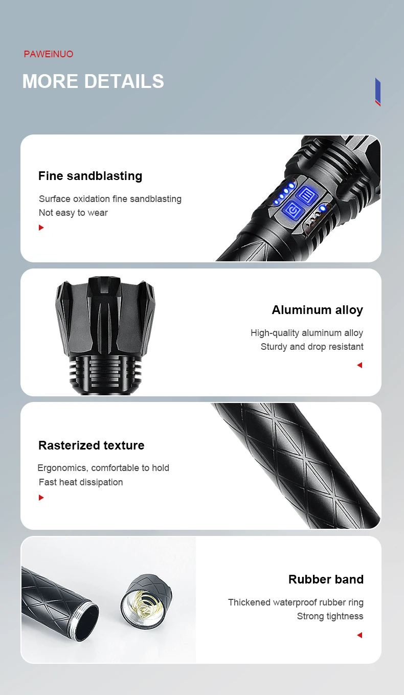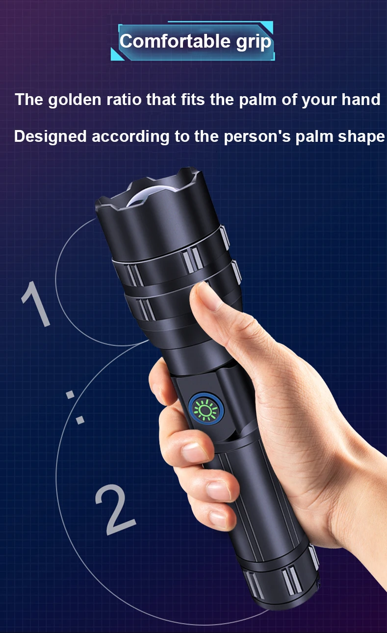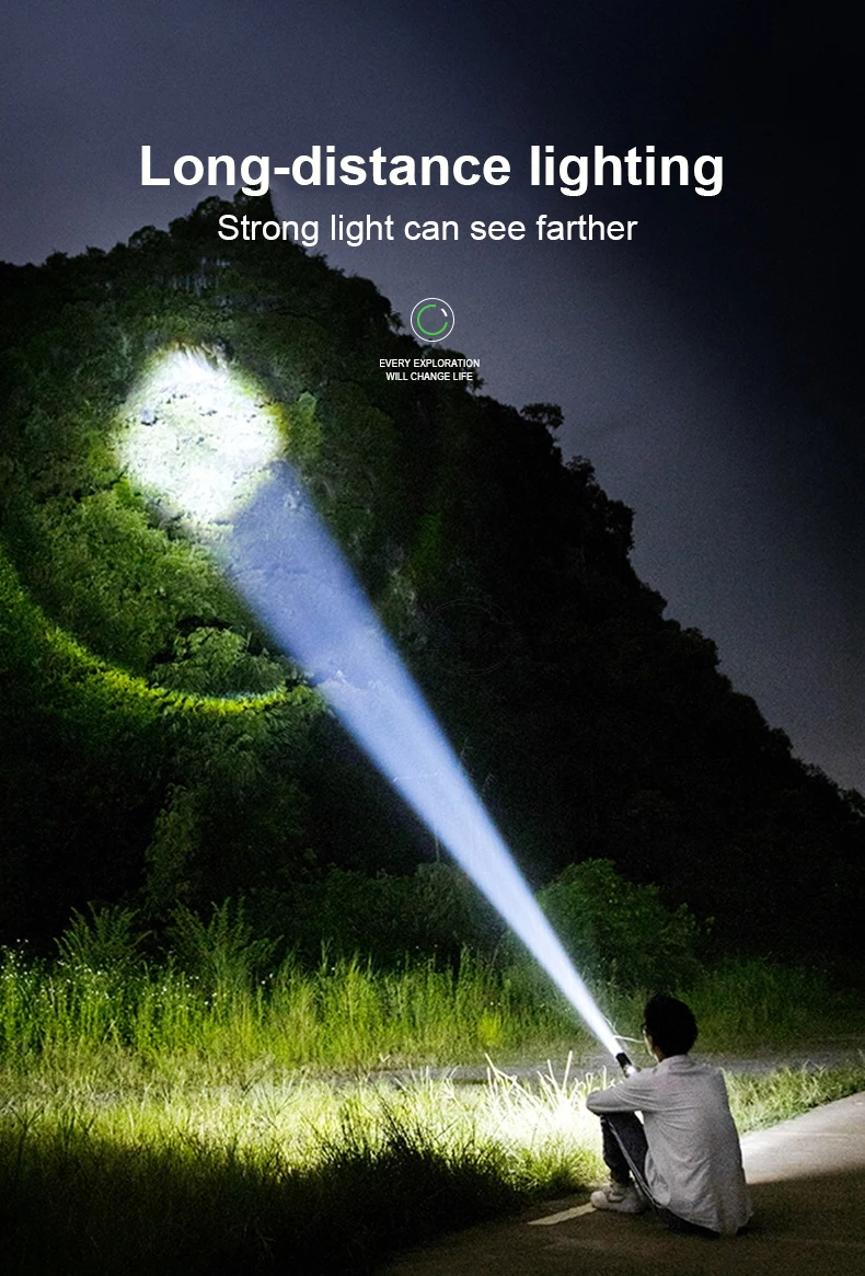 ※Этот фонарик super XHP199-один из самых ярких фонарей. Его яркость эквивалентна яркости трех фонарей XHP90. Основной корпус фонарика имеет два ряда смарт-дисплей светодиодный Ламповые бусины, таким образом, вы может заплатить внимание на фонарик в любое удобное для Вас время. Он использует 2*18650 и 2*26650 батареи, что значительно увеличивает время использования фонарика. Это дорого, но эффект очень хороший. Спасибо за вашу поддержку.