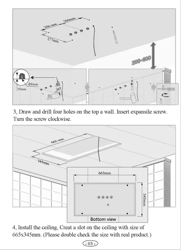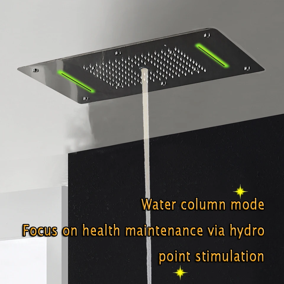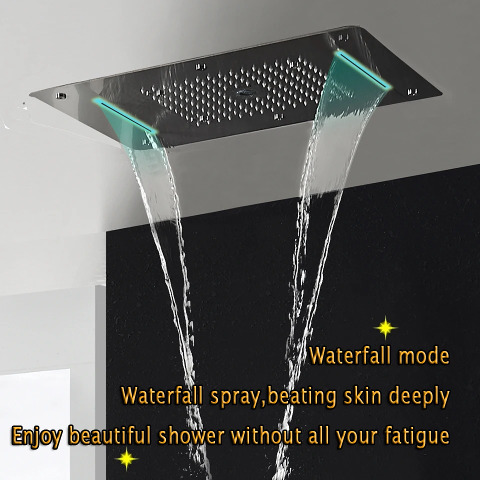Он изготовлен из SUS304 и черного матового материала, Размер 700x380 мм, есть 4 функции в комплекте: осадки, водопад, пузырь и туман, роскошный светодиодный светильник, испытано с 3 бар давлением воды, Скорость потока: туман: 9л/м; Дождь: 15л/м; Водопад: 15л/м; Пузырь: 15л/м; Он был встроен в потолок, когда мы устанавливали его, размер отверстия потолка 665*345 мм. Напряжение питания, используемое для душевой головки, составляет 90 ~ 260VAC.