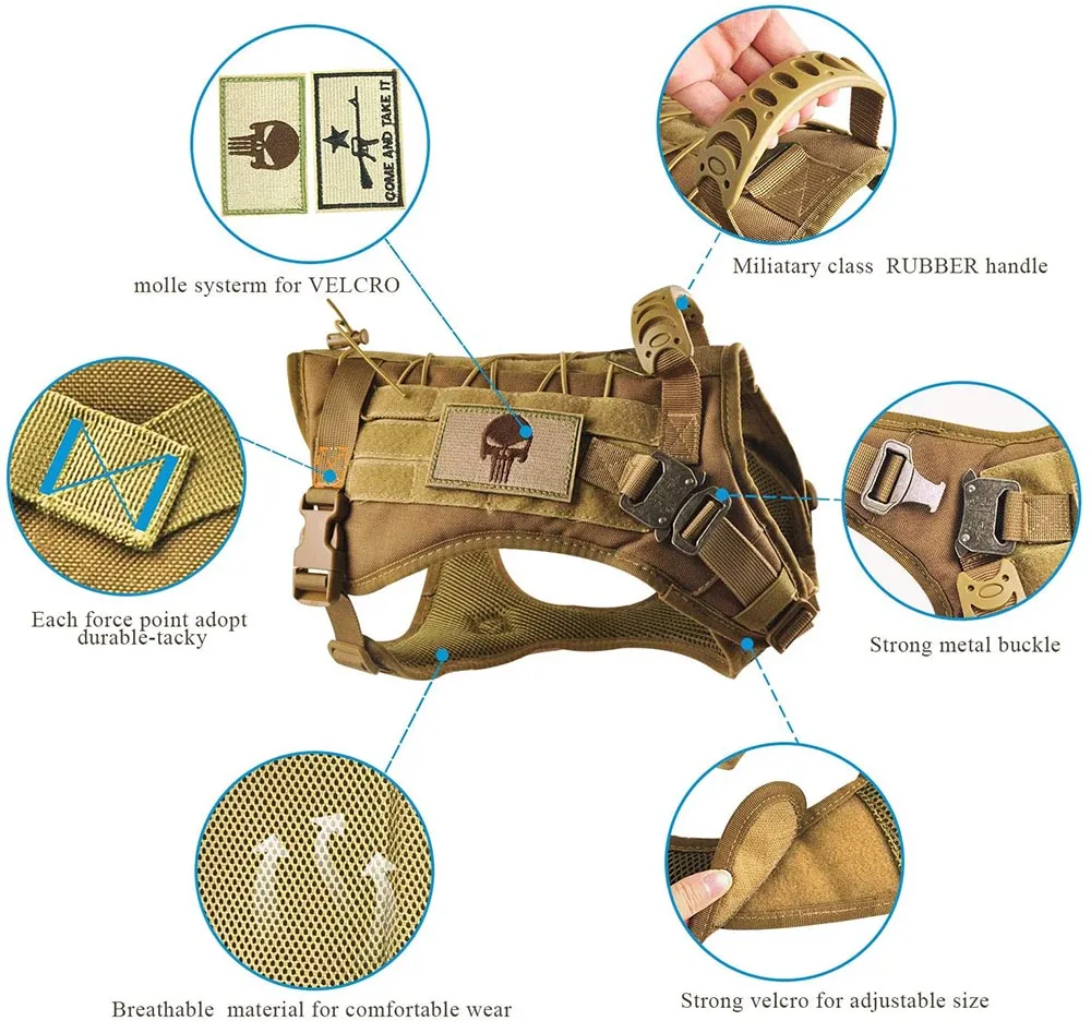 В частности, мы используем металлическую защитную пряжку и липучку. Шитье брутто на каждом шарнире и тяжелой нагрузке, плотно и надежно. Больше безопасности, собачий жилет для обслуживания собаки может выдержать огромное напряжение, когда собака движется.