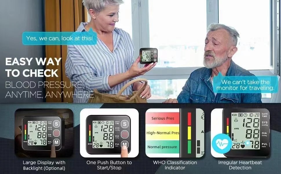Цифровой монитор артериального давления Justlang чрезвычайно прост в использовании с одной кнопкой, полностью автоматическим сжатием и декомпрессией. Просто наденьте запястье, нажав кнопку переключения, и вы получите точные показания в течение 60 секунд.