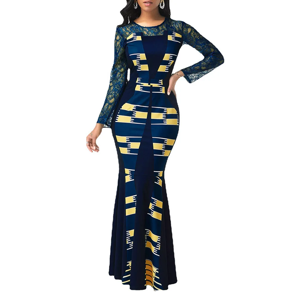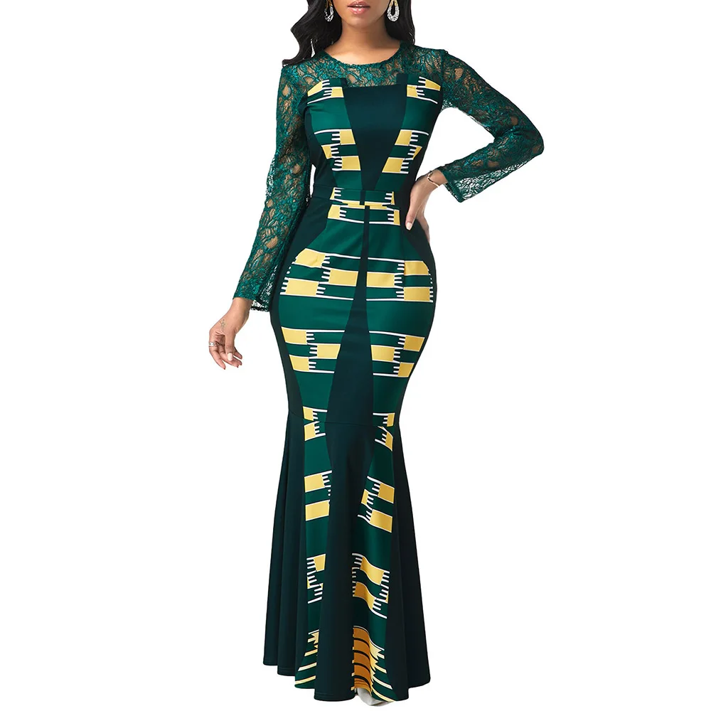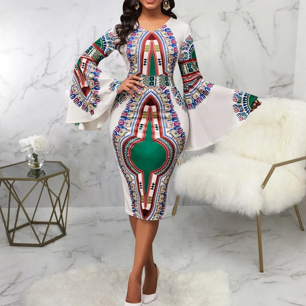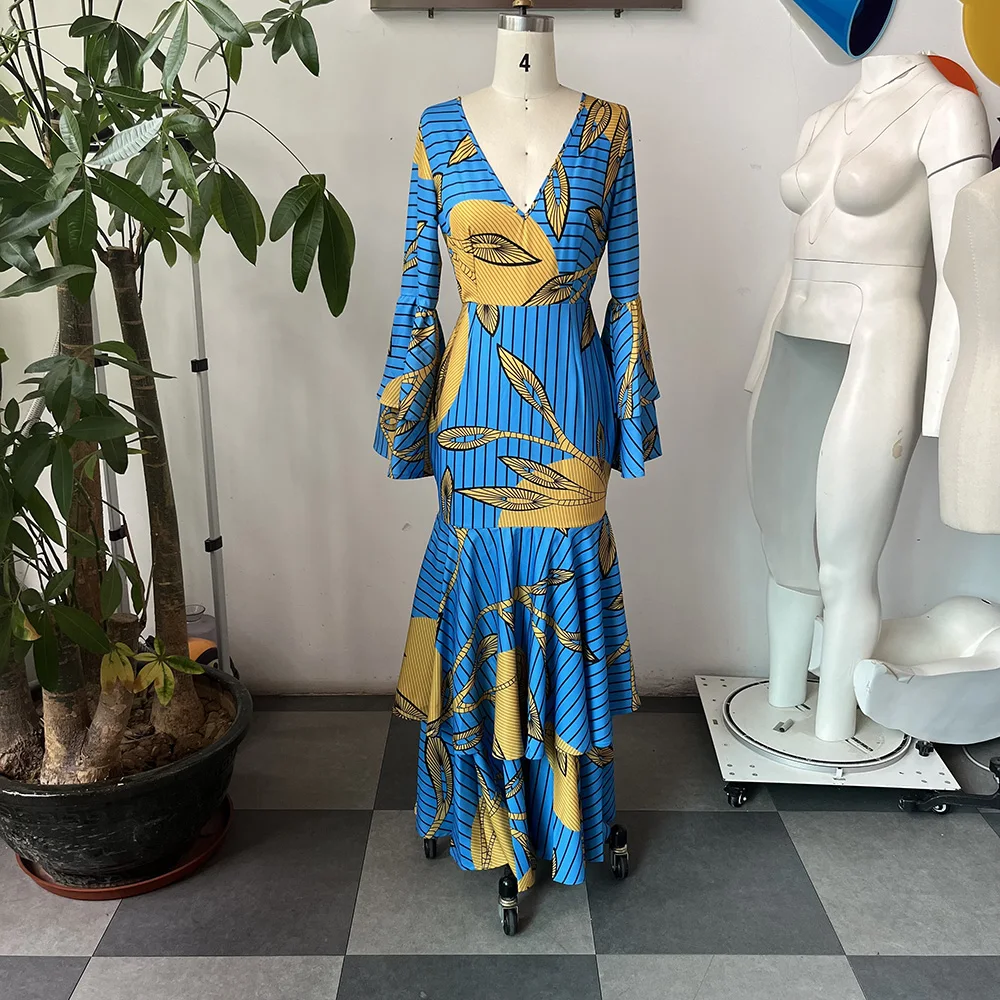 Женское длинное платье с юбкой годе, расклешенное платье с Африканским принтом, весна 2022, модные пикантные женские вечерние платья с оборками и длинными рукавами с глубоким V-образным вырезом Robe longue évasée à imprimé africain pour femmes, style siréne, à volants, manches longues, décolleté en v profond, Sexy, robes de soirée, printemps, 2022 Vestido largo acampanado con estampado africano para mujer, Moda de Primavera de sirena, volantes, manga larga, cuello en V profundo, Sexy, vestidos de fiesta para mujer 2022