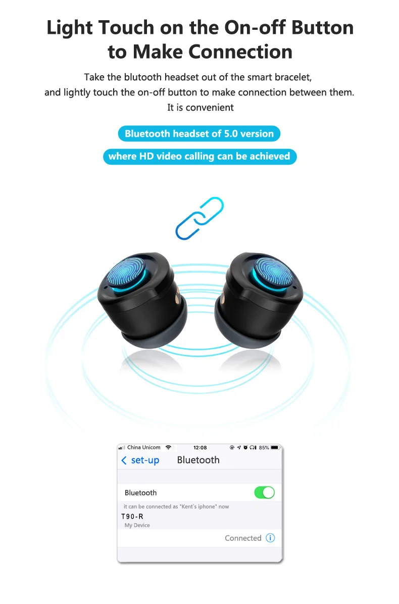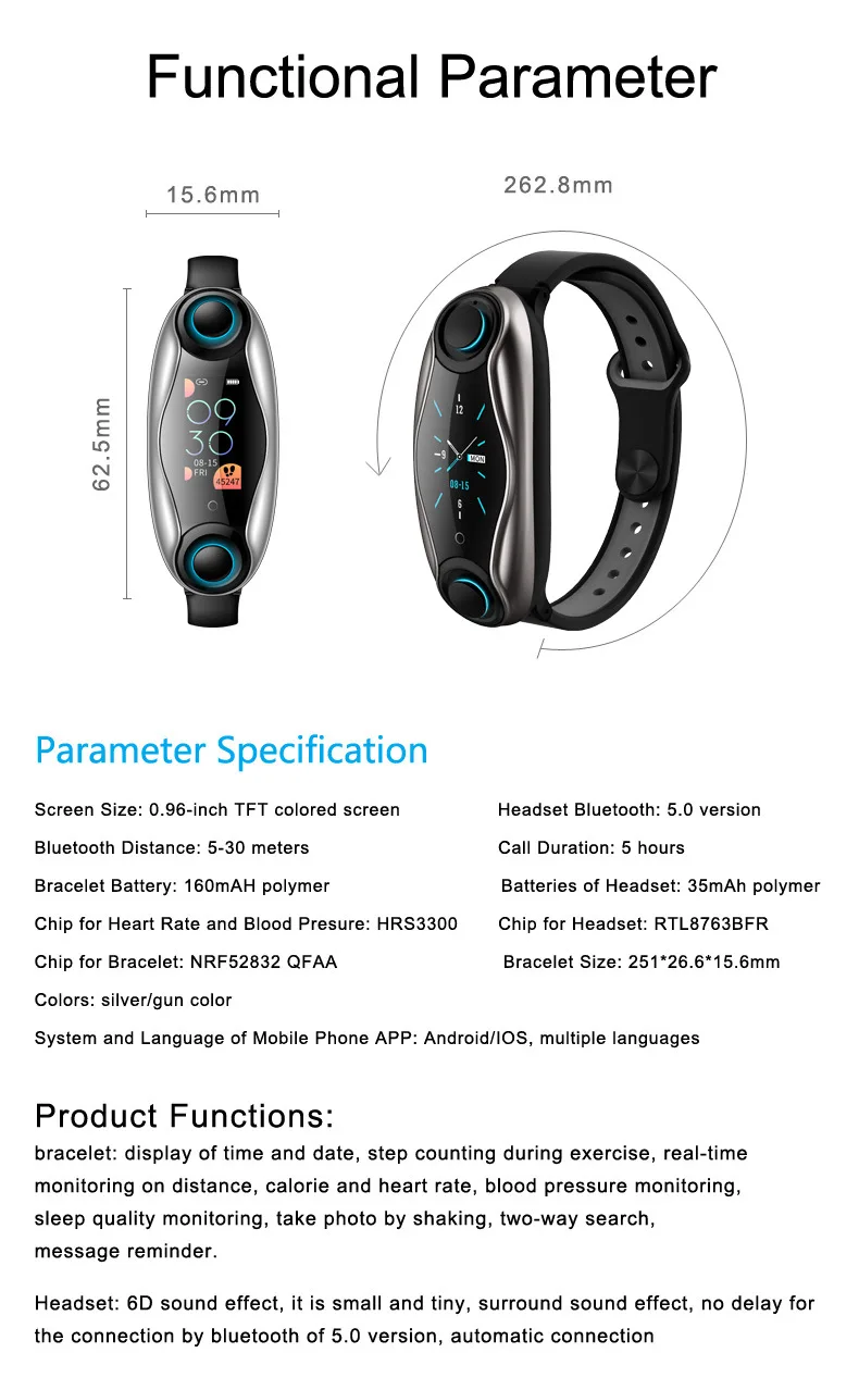 Функции: отображение даты времени, спорт, пульс, кровяное давление, напоминания приложений, уведомления о сообщениях, ответ на вызов, шагомер, шаг, калории, запись истории упражнений, удаленная камера, будильник, анти-потеря, BT гарнитура, BT Музыка, несколько языков.