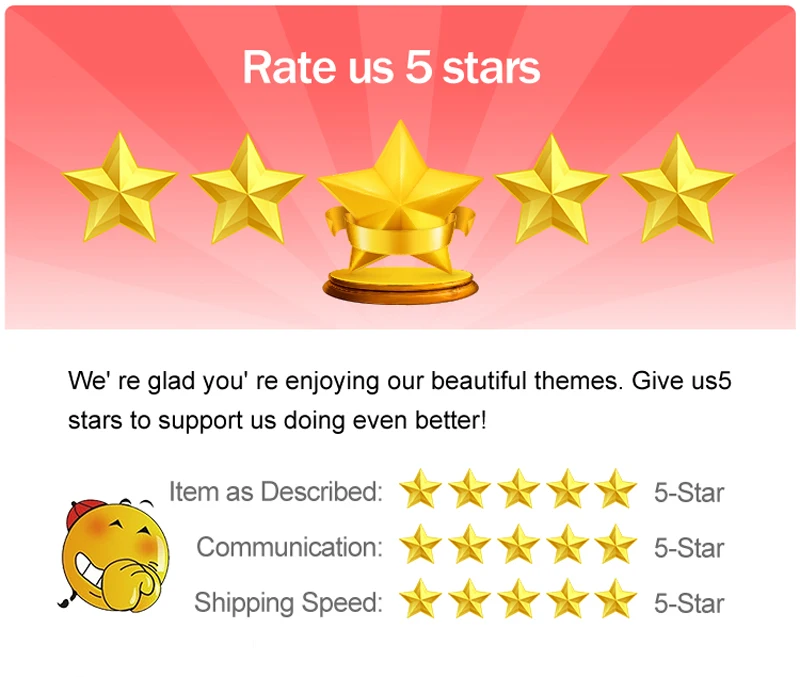 1. Их отзывы очень важны для нас, пожалуйста, потратьте несколько секунд, чтобы получить 5 звезд, если вы удовлетворены нашим продуктом и обслуживанием, большое спасибо!