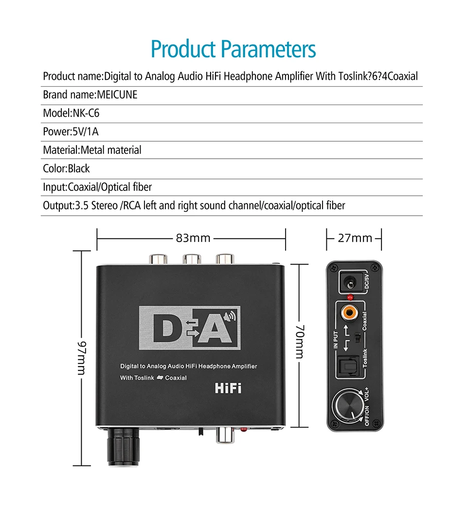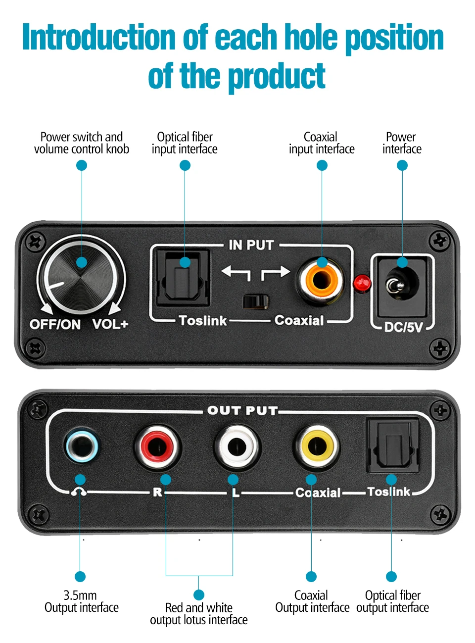 Этот цифро-аналоговый аудио конвертер предназначен для домашнего или профессионального аудио переключения. Он преобразует коаксиальные или Toslink цифровые аудиосигналы в аналоговый аудио L/R и может быть подключен к внешним устройствам, таким как усилители, через стандартные разъемы типа RCA. Также вы можете прикрепить ее к выход 3,5 мм для наушников, подключаться к высокой четкости наушники, конвертер форм невелик, просты в установке, встроенный высококачественный усилитель чип, наушники и выходной порт RCA могут легко запускать Наушники высокой точности 16-300 Ом, продукт поддерживает отключение питания, регулировка громкости, легче адаптироваться к различным источникам, различным средам, Продукт также поддерживает Вход Toslink для Toslink, коаксиальный выход, коаксиальный вход для Toslink, коаксиальный выход, может адаптироваться к большему интерфейсу цифрового аудио усилителя.