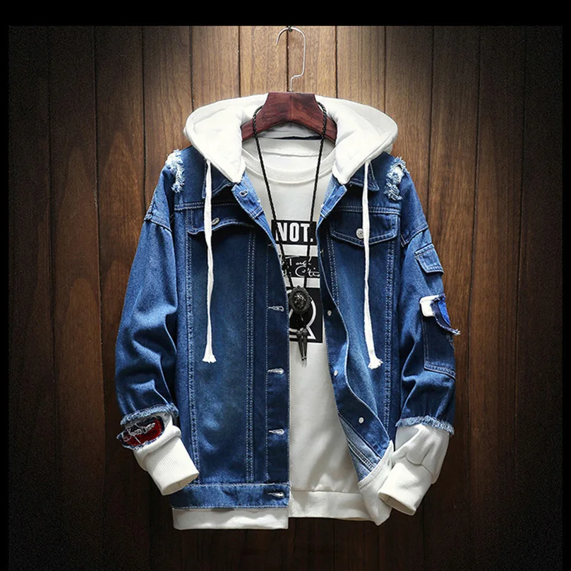 Трикотажная джинсовая куртка с капюшоном для мужчин; Модная Джинсовая куртка в стиле пэчворк; Мужская Уличная одежда; Сезон весна-осень; Корейский стиль; Ковбойский стиль; 2021