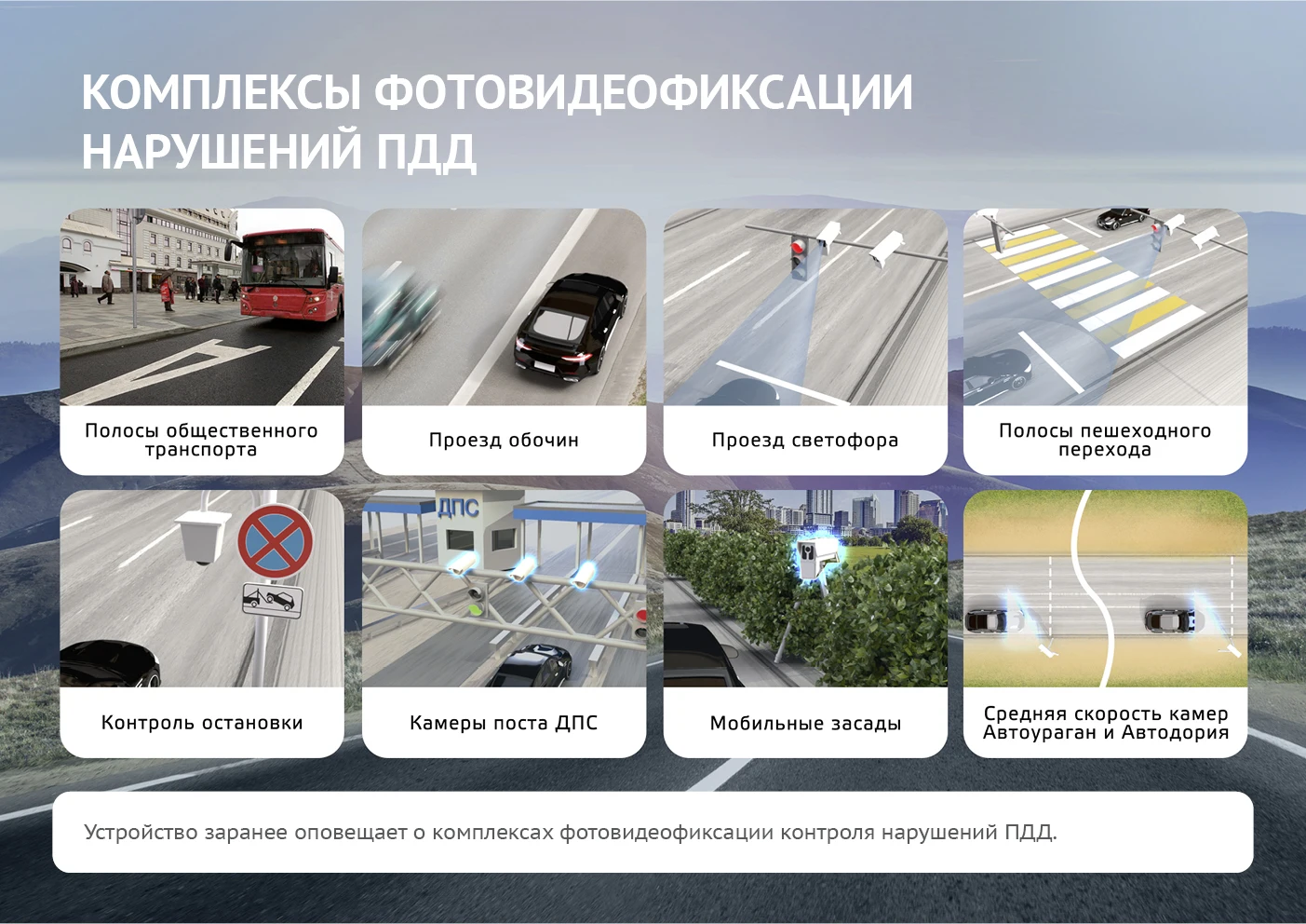 The device, thanks to the GPS-module and an updated 2-point data base of the cameras of 45 countries (Russia, the CIS: Uzbekistan, Kazakhstan, and others, timely noalerts) mesta, vocord, RedSpeed, scat, robot, multaradar), "Steam cameras" without radar block, compute average speed (Autohurricane, avtodoria, serghek).