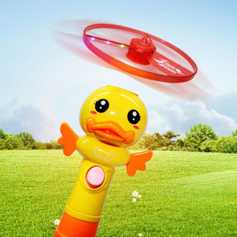 Новинка дизайн бамбуковой стрекозы: Новинка Летающая дисковая игрушка, имитация бамбуковой стрекозы со светодиодным светильник, Одно нажатие для активных игрушек, дизайн ручки в форме милой утки, верхний диск может лететь и парить и вращаться в небе, Идеальный открытый и ночной игровой набор для детей.