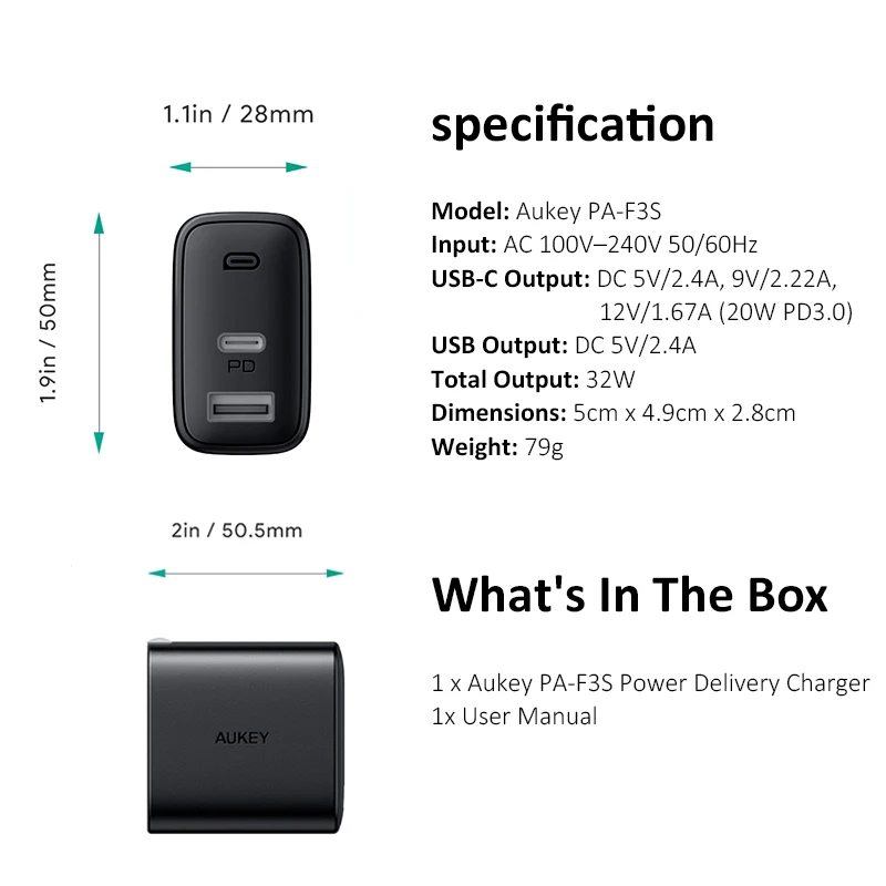 AUKEY PA-F3S вилка стандарта США 32 Вт PD USB C быстрое настенное зарядное устройство Быстрая зарядка зарядная станция для стол на мобильный телефон