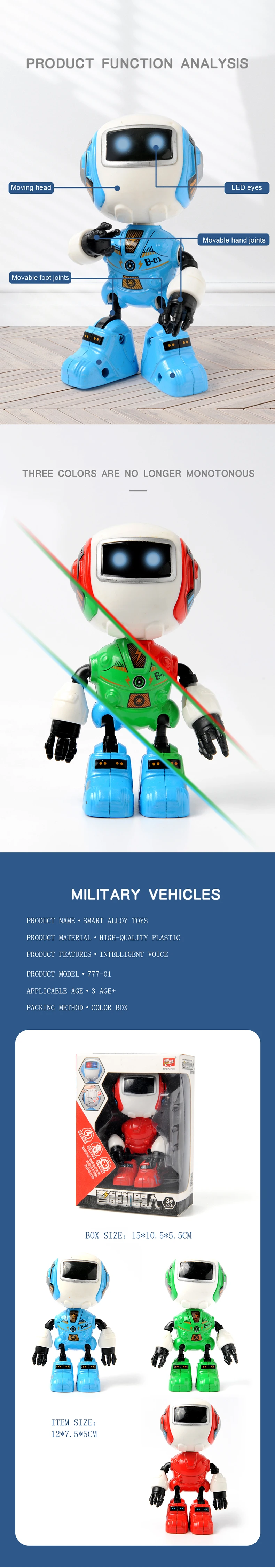 【Дизайн и гарантия качестваЭтот говорящий робот-игрушка имеет 11 подвижных суставов, которые могут вращаться на 360 градусов. Вы можете выбрать, чтобы скрутить его как украшение или мобильный телефон держатель, сенсорный датчик на лбу может реагировать на звуковые эффекты и триггерные мерцающие огни с глазами робота. Просто прикоснитесь к нему, чтобы почувствовать свои различные эмоции!