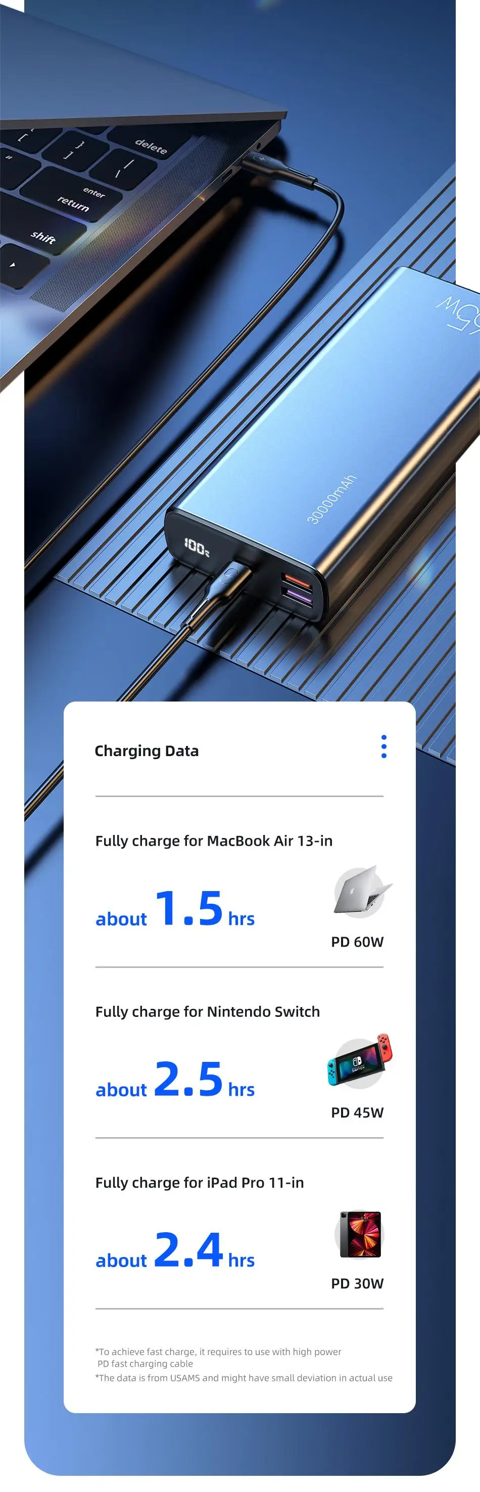 Быстрая зарядка PDДля полной зарядки требуется всего 3 часа, вход PD 45W, быстрая зарядка для внешнего аккумулятора, значительно сокращает время ввода.