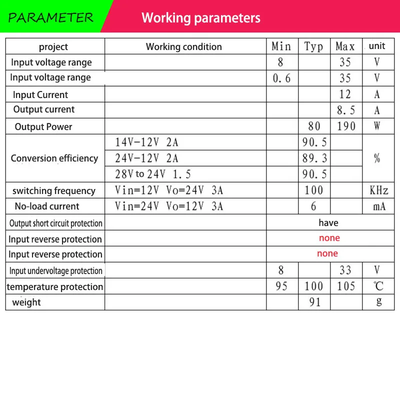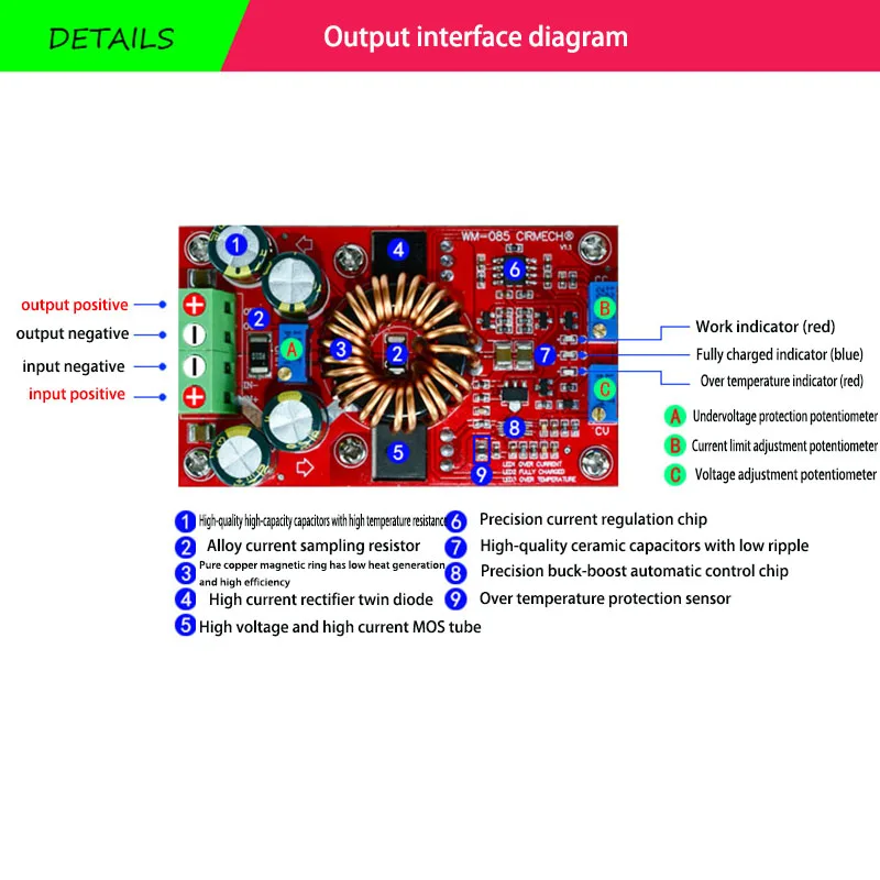 6. Защита от пониженного напряжения/Защита от перегрева/Защита от короткого замыкания добавляется к традиционному модулю buck-boost, который может эффективно защитить аккумулятор, избежать «потери энергии», И автоматически уменьшает напряжение, когда температура слишком высока, и безопасность значительно улучшается.