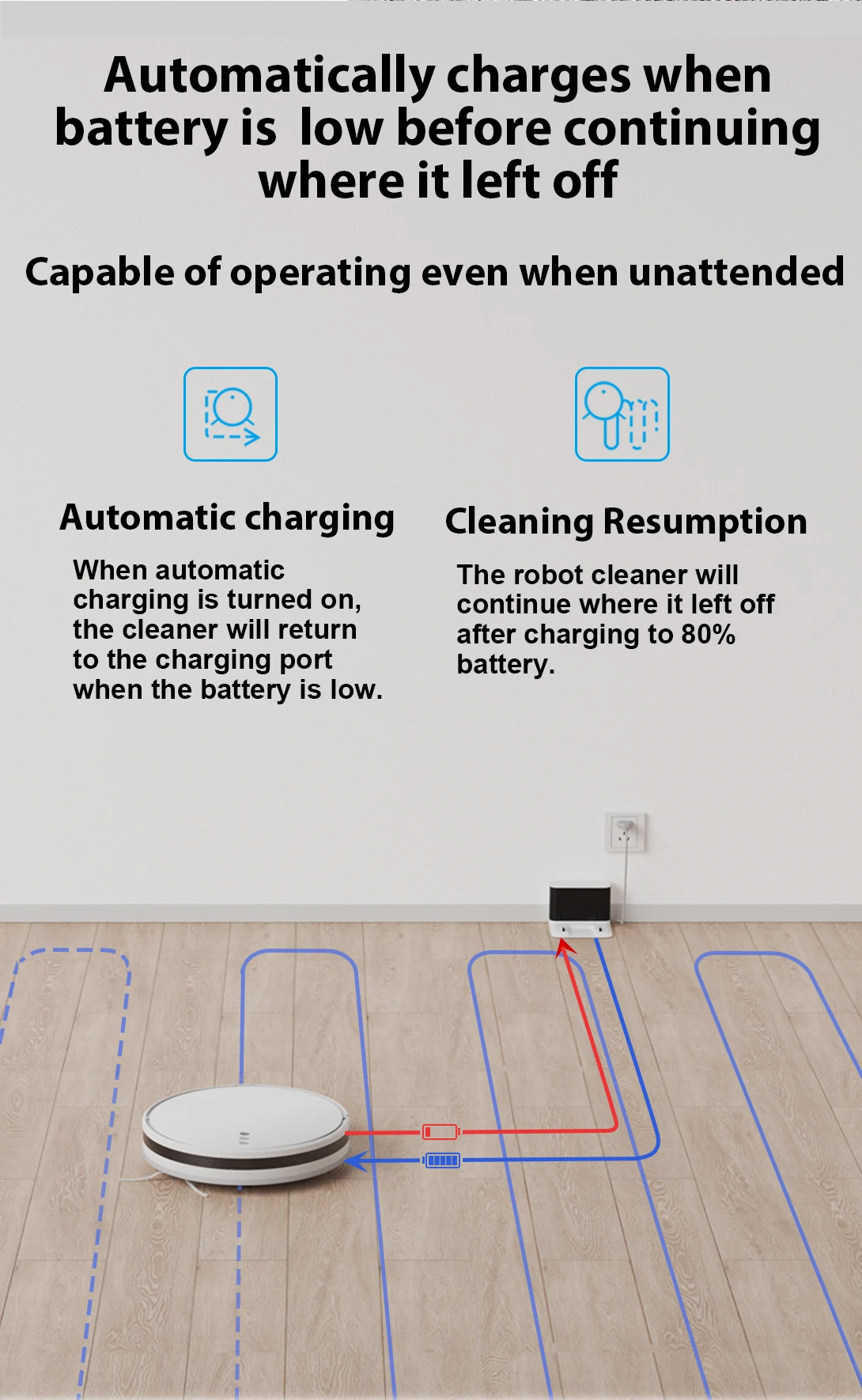 Робот-пылесос продолжит работу с того места, на котором остановился, после зарядки аккумулятора до 80%.
