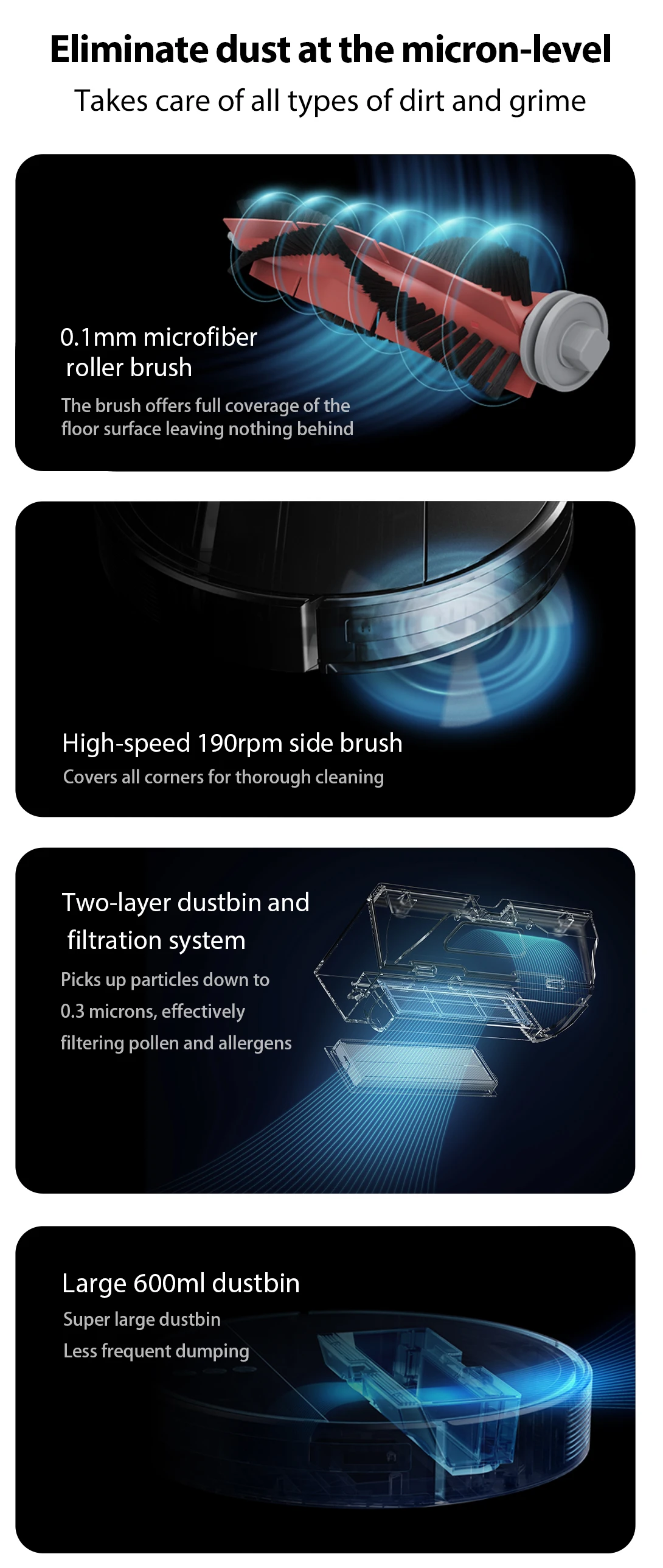 Всасывающее отверстие большого диаметра + Мусорный бак большой емкости + Мощная щетка собирает пыль с большей мощностью для эффективной уборки