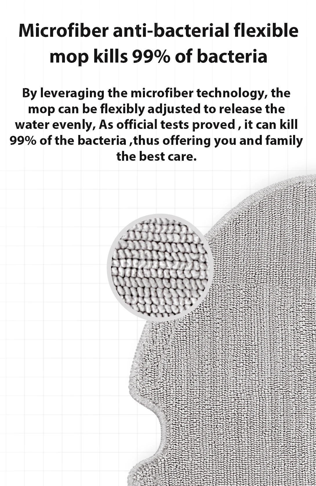 Используя технологию микрофибры, швабру можно гибко регулировать для равномерного выпуска воды. Как показали официальные тесты, она может убить 99% бактерий, тем самым предлагая вам и семье лучший уход.