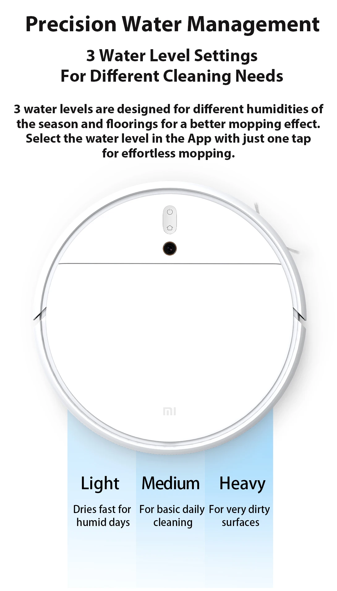 3 уровня воды предназначены для разной влажности в зависимости от времени года и напольных покрытий для лучшего эффекта мытья полов. Выберите уровень воды в приложении одним касанием, чтобы мыть полы без усилий.