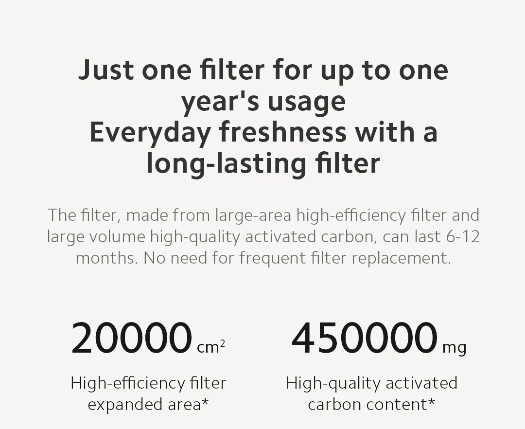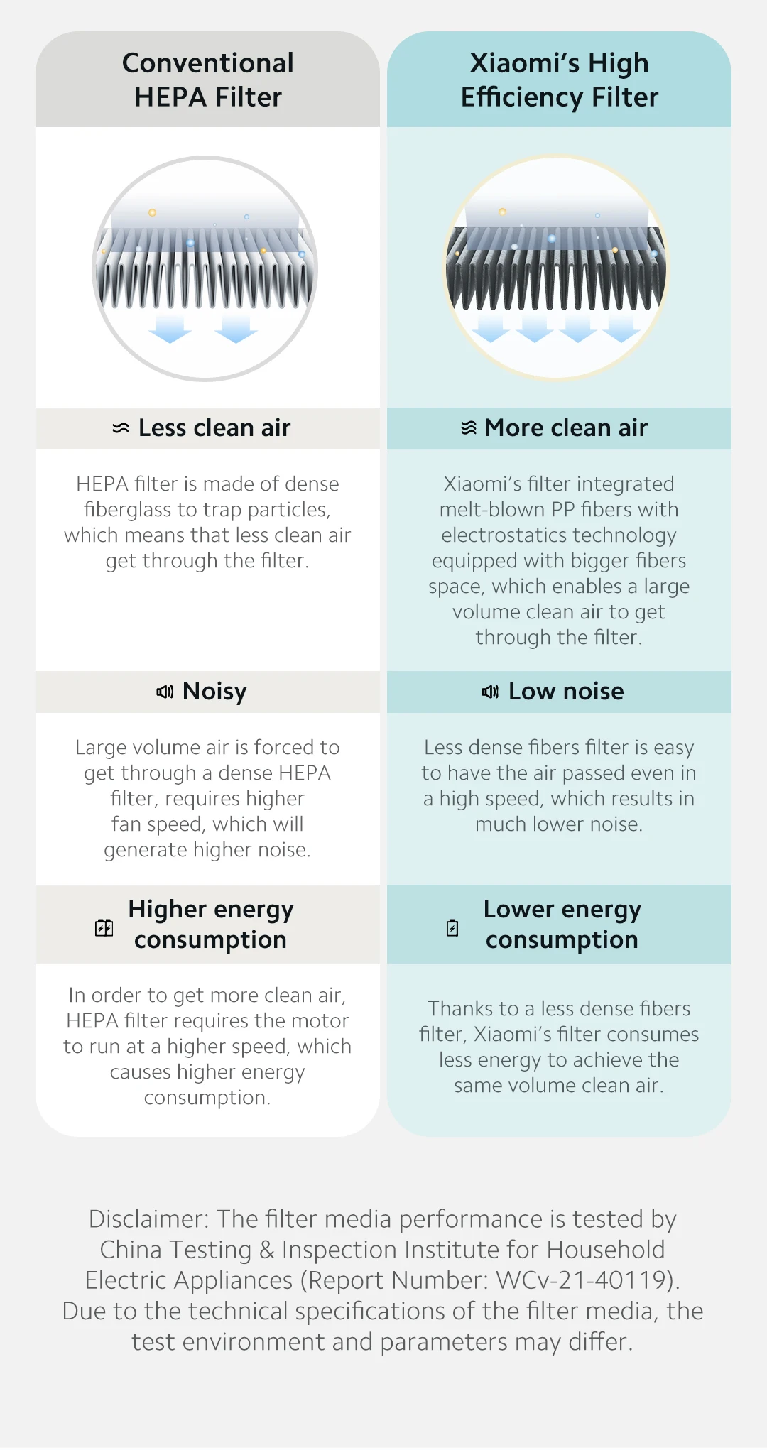 Сочетают в себе два фильтра технологии: электростатический charqe и механической фильтрации Xiaomi имеет высокую эффективность фильтрующие материалы могут удалить 99.97% частиц воздуха в вниз минимальный размер 0,1 микрометра и поглощает пыль, PM 2,5 пыльцы, pet dander, и курить даже самые маленькие микропластмассы. Для мелких частиц до 0,3 мкм, Xiaomi, и он имеет высокую эффективность фильтрующих сред скорость фильтрации составляет 99.97%, а также для частиц как малых по мере того как 0,1 микрон, скорость фильтрации может достигать до 99.99%
