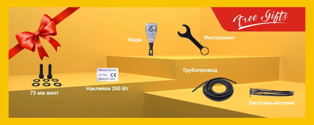 Подарки: экипажи 73 мм * 1, трубка * 1, инструмент * 1, стяжки * 1,250 Вт * 1, фара * 1