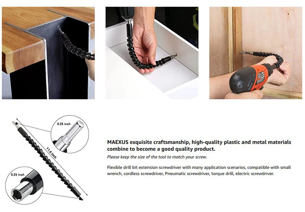 Сгибается, скручивается и превращается для использования дрели в плотных и замкнутых пространствах. Подходит для обычной ручной дрели и электрической дрели с идеальной производительностью. Применяется для технического обслуживания и ремонта оборудования, включая компьютерное шасси, электрические шкафы, мебель, электроприборы и т. Д.