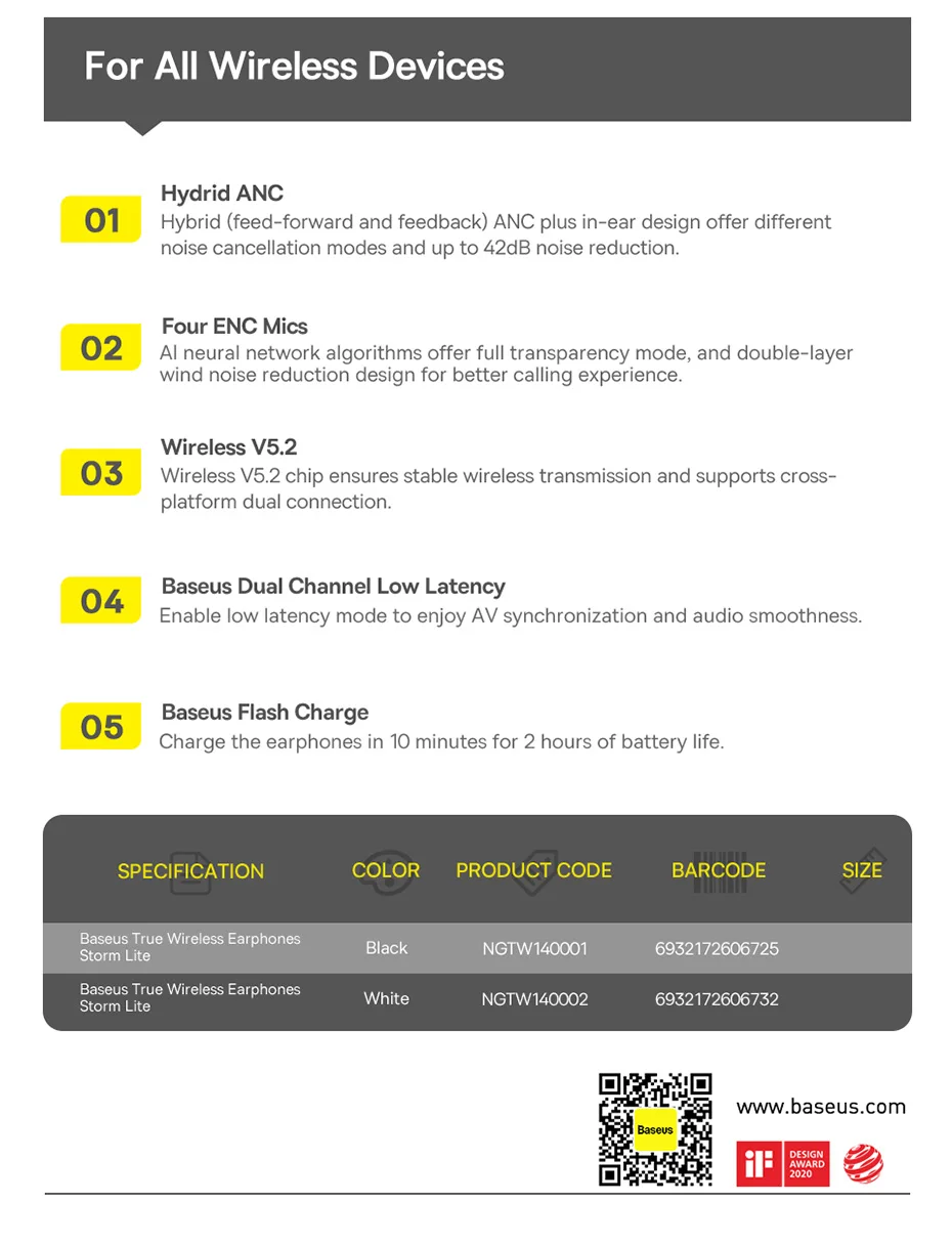 Название: Baseus настоящие беспроводные наушникиМодель No.: Baseus шторм Лайт (M2)Материал: АБС-пластик + ПоликарбонатВерсия: V5.2Радиус связи: 10 мНепрерывной работы: 5 часов (70% громкости)Удовольствия от игры с зарядным футляром: 25-30 часовЕмкость батареи:: 40 мА * ч/0,148 Wh (наушники) 400 мА-ч/1,48 Wh (зарядным футляром)Наушники рейтинг вход: DC5V 80 мАЗарядным футляром рейтинг вход: DC5V 600 мАНаушники Рейтинг потребляемый ток: 10 мАЗарядным футляром Рейтинг потребляемый ток: 160 мАВремя полной зарядки: Около 1 часаДиапазон воспроизводимых частот: 20 Гц-20 кГцПорт для зарядки: Type-CПодходит для: Совместим с большинством беспроводных устройствКласс водонепроницаемости: IPX5Вес продукта: 42,3 г