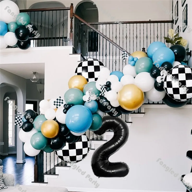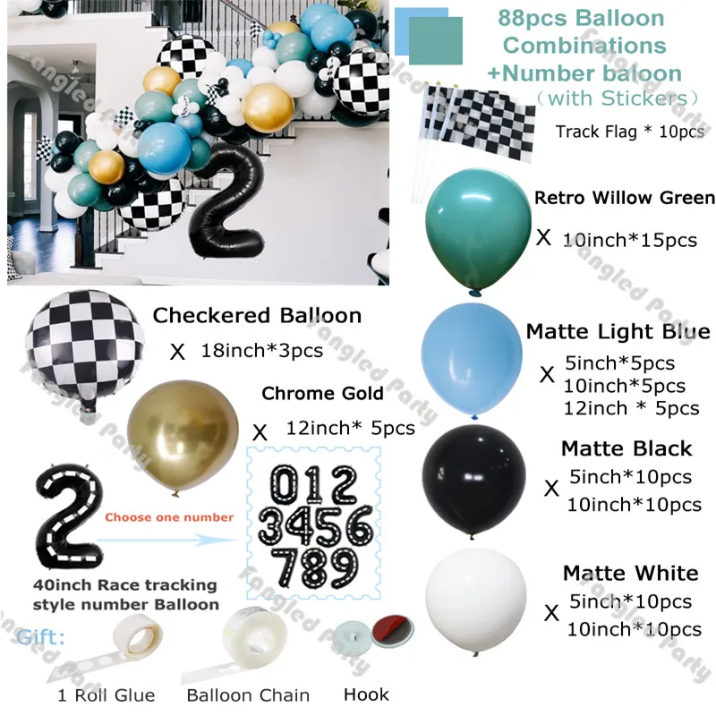 88 шт., Ретро стиль, Willow, зеленый, черный, белый, детский душ, клетчатый шар, арка, два скоростных гоночных автомобиля, для первого дня рождения, для вечеринок