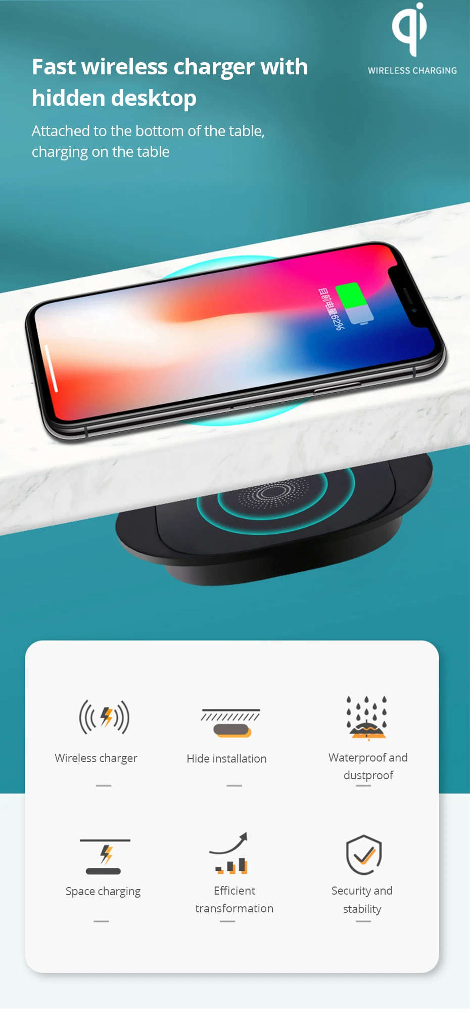 Настольные невидимые беспроводные зарядные устройства Qi для Samsung S22/S21/iPhone XR/8/Xiaomi/Oneplus 20 мм Беспроводная зарядка на большие расстояния