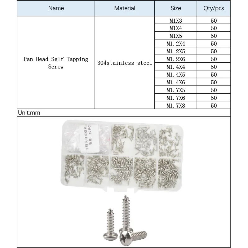 2. Спецификация:Тип винтов:Филлипс головкой self-винт стукРазмер: M1 M1.2 M1.4 M1.7Материал: нержавеющая сталь 304Посылка: 600 шт. винтов
