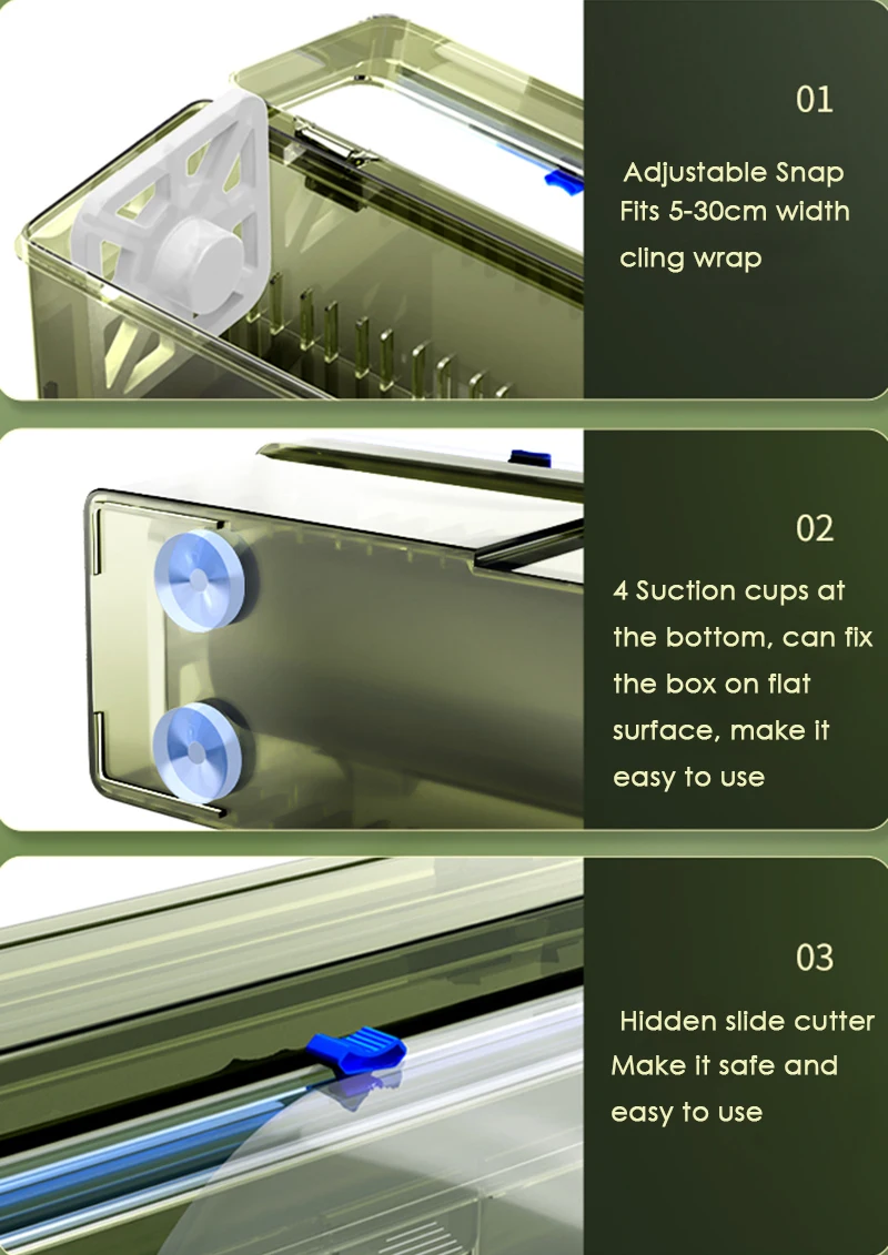 2. Инновационный ползунковый резак, отличается от других обычных пластиковых пленок, которые должны быть разорваны вручную, наша пластиковая обертка помещается внутри дозатора с резцом. Без опасного пильного лезвия, вы можете получить аккуратную и красивую пластиковую пленку, Просто вытащите необходимое количество, а затем проведите маленькую молнию на другую сторону. Он водонепроницаемый, пыленепроницаемый и маслостойкий и может эффективно избежать отходов.