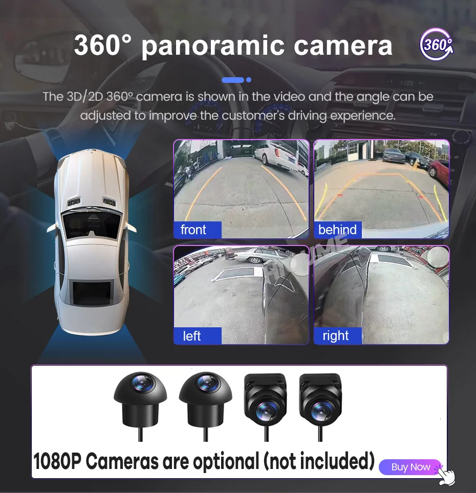 > Поддержка автомобильной фабрики 360 камера/aftermarket камера и заводские парковочные датчики, экран автоматически переключается на изображение парковки, когда механизм обратного хода включен. Поддержка 1080P AHD камеры, поддержка 360 ° камеры наблюдения за птицами. (камеры s не включены)