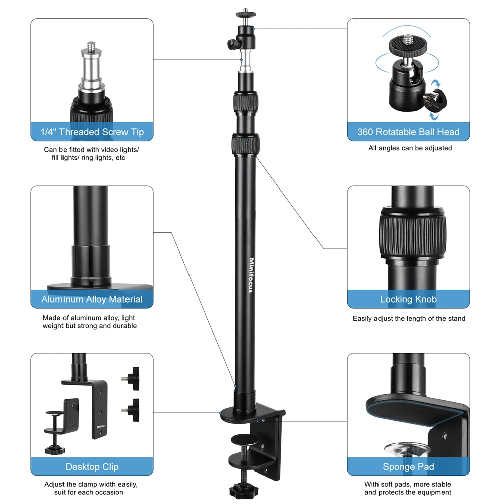 【Широкое применение 】 Выдвижная настольная подставка с шариковой головкой 1/4 ", подходит для камеры, кольцевой светильник s, видео светильник s, кольцевой светильник, веб-камера, микрофоны и другое оборудование с винтовыми отверстиями 1/4".