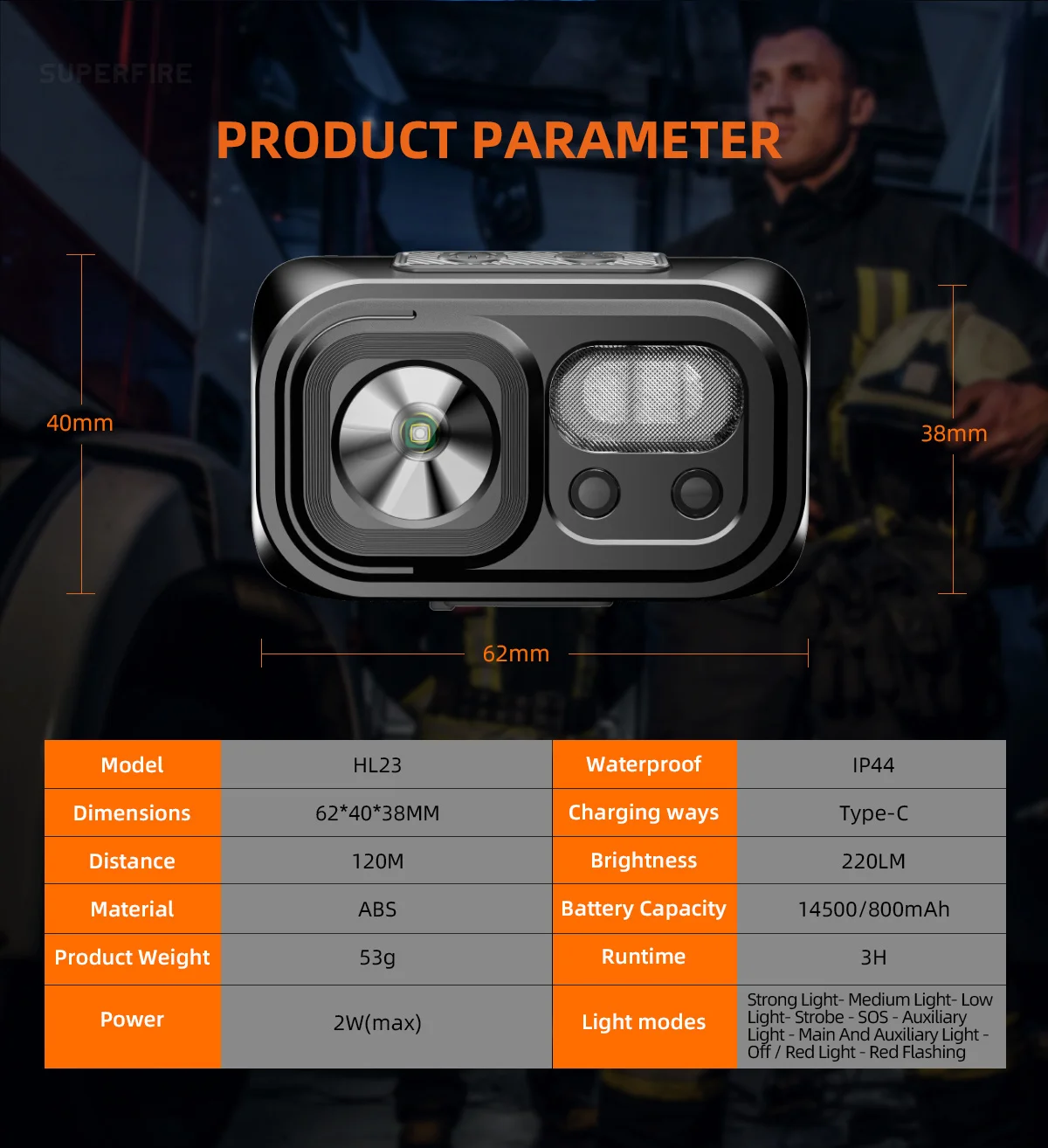 Основной светильник/дополнительный светильник/красный светильник, Встроенная перезаряжаемая батарея, многофункциональная фара с датчиком движения.