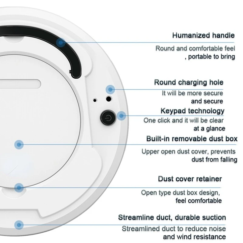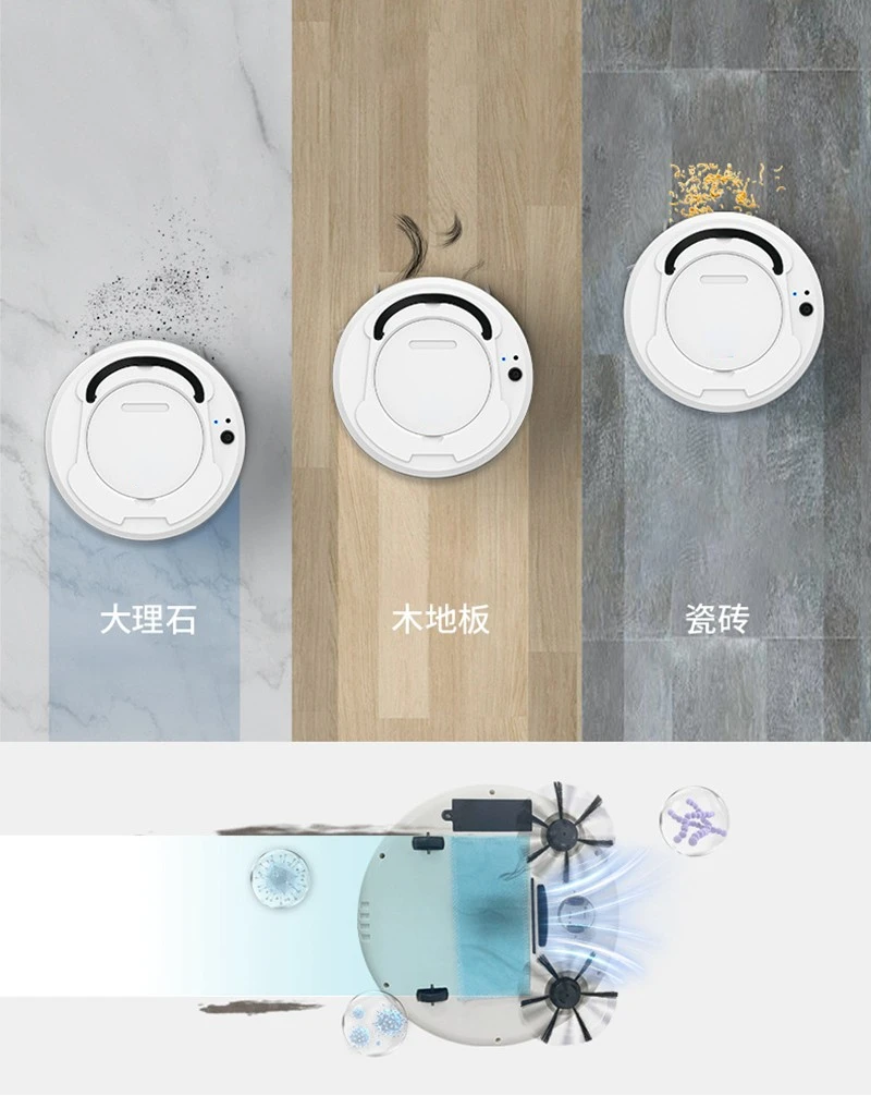 Функции: запуск одной кнопкой, подметание, уборка, пылесос, зарядка через USB, универсальное вождение, автоматическое Предотвращение препятствий, защита от падения, низкий уровень шума и отсутствие помех, низкое повторение, высокий охват