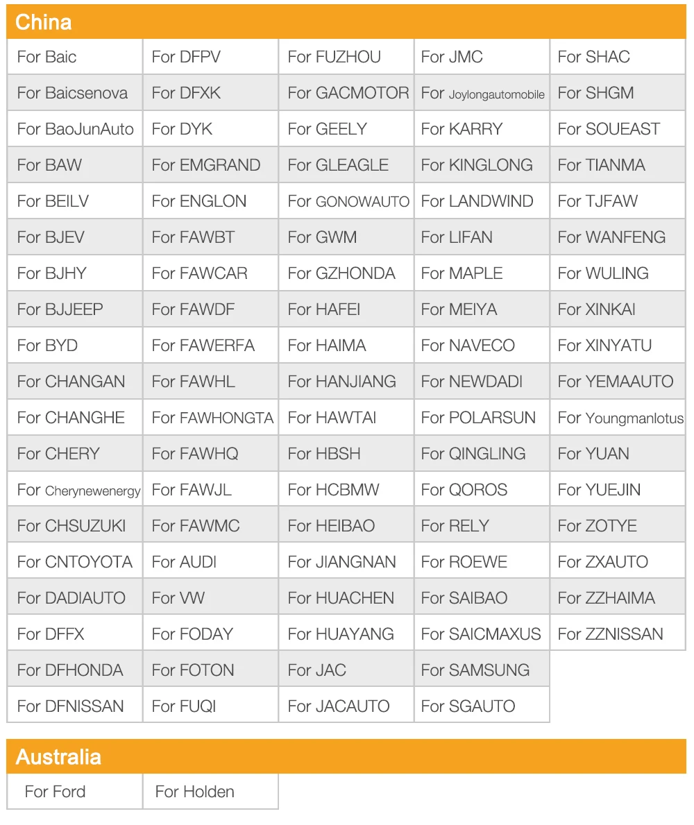 Китай: BAOJUNAUTO, BJHY, BYD, CAFORD, CHANGAN,CHERY, DFCITROEN, DFFX, DFHONDA, DFNISSAN, DFPEUGEOT, DFPV, DYK, FAWBT, FAWCAR, FAWVW, GEELY, GZM, gzwbt, honda HAIMA, HCBMW, HUACHEN, JAC, LIFAN, RELY, RIICH, ROEWE, SAICMG, SHAC, SHGM, SHVW, TJFAW, WULING, YOUNGMANLOTUS, ZXAUTO, ZZHAIMA, ZZNISSAN, FAWTOYOTA, GZTOYOTA