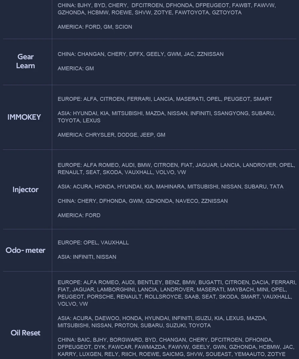 Включает: системы ABS, системы двигателя, системы SAS, Системы TPMS, системы IMMO, системы батареи, системы обслуживания масла, системы SRS, и т. Д...