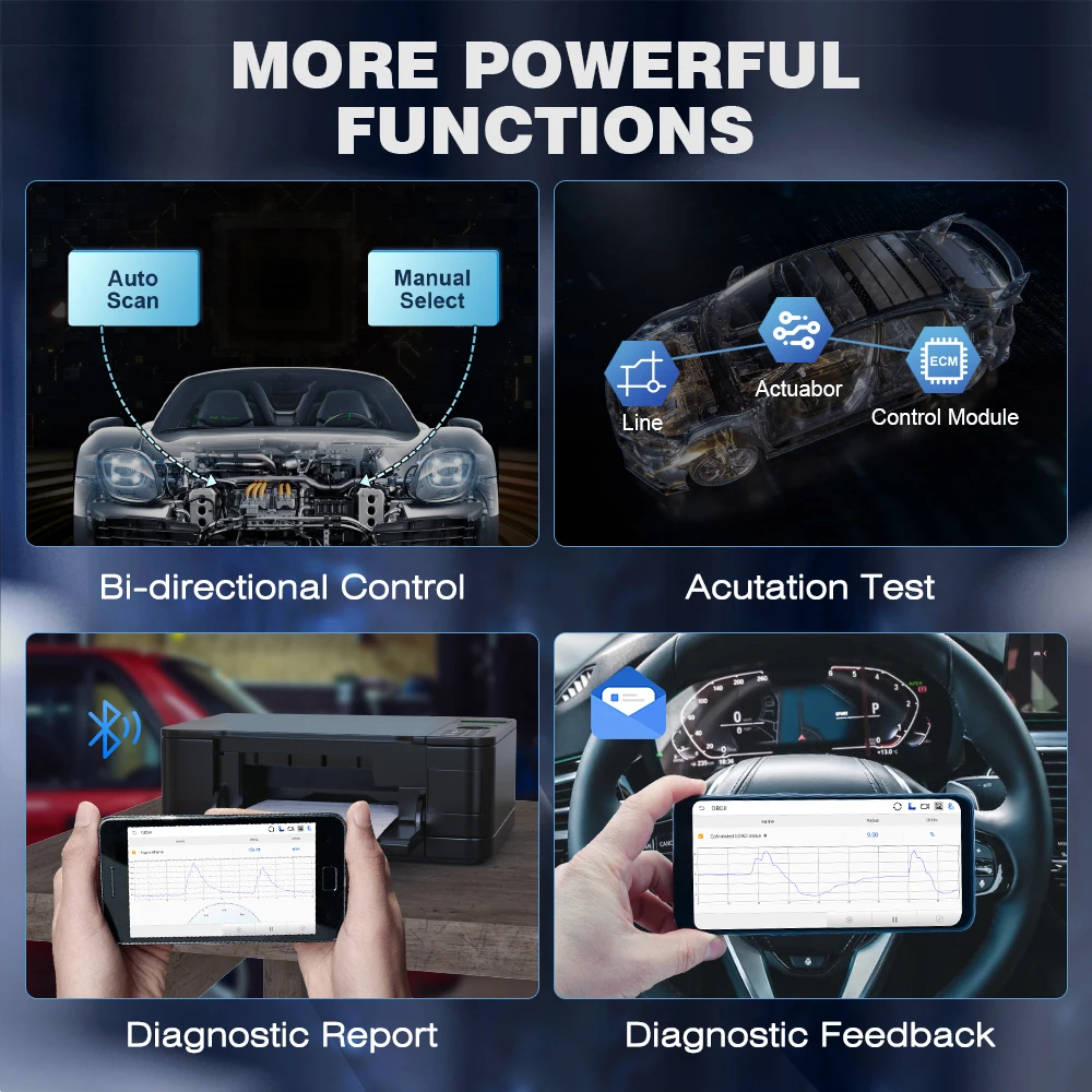 Функции диагностики включают в себя: чтение DTCs, четкие DTCs, чтение datastream, испытание на приведение в действие, кодирование ECU и 16 специальных функций и т. Д.