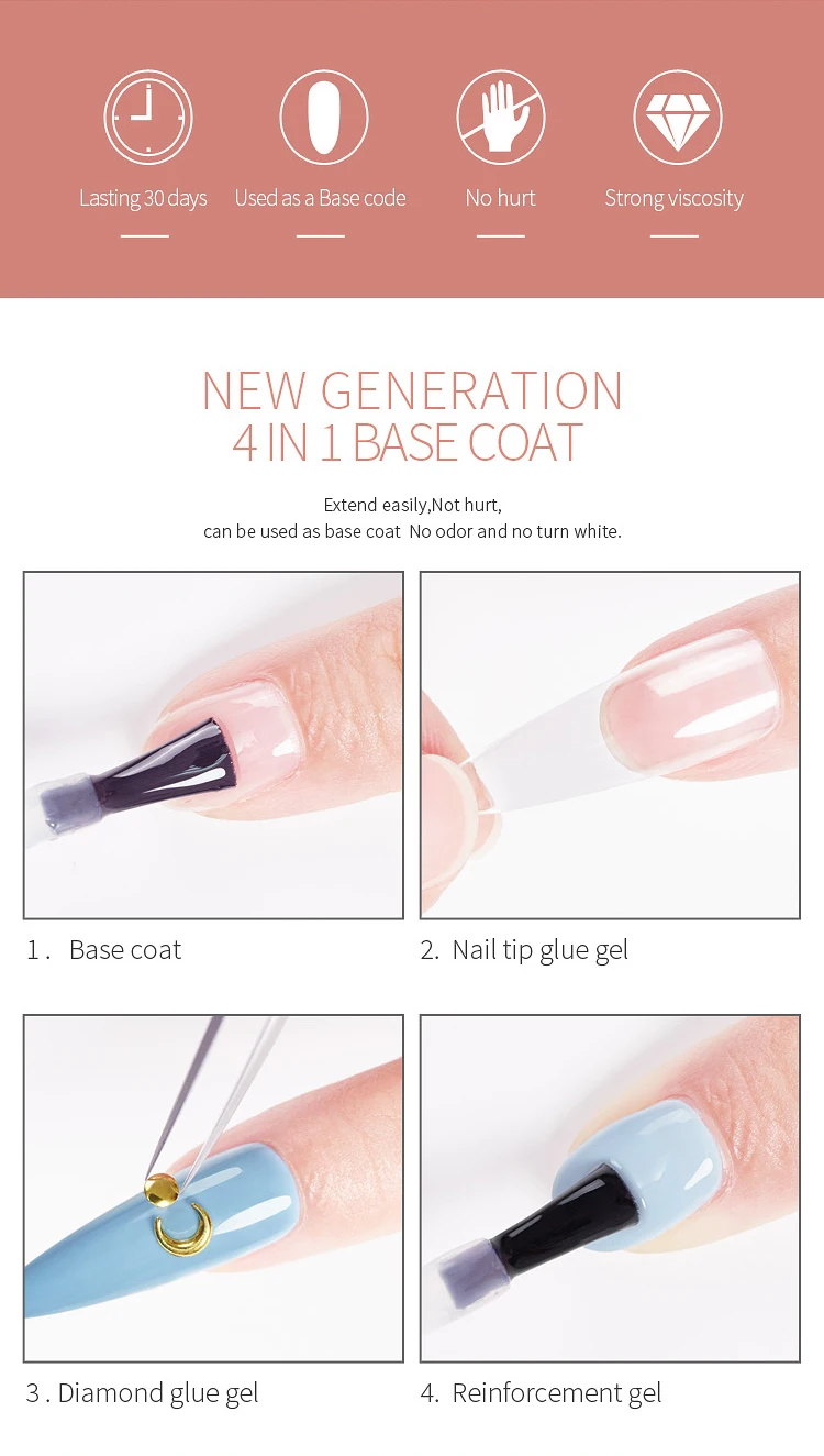 4 in 1 : Base Coat, Reinforce Gel, Nail Tip Glue Gel, Diamond Glue Gel