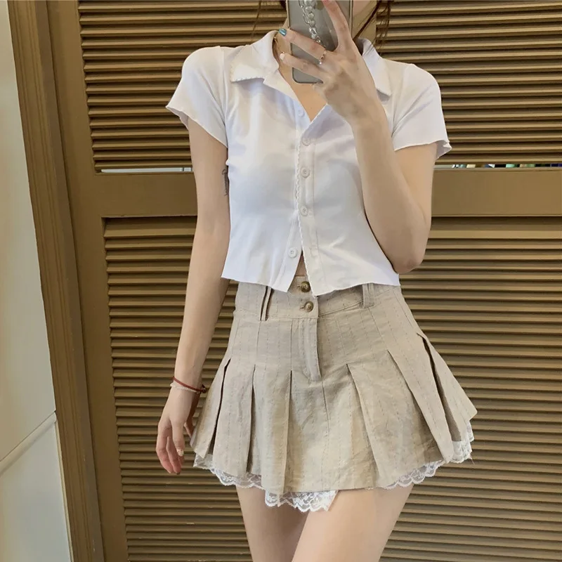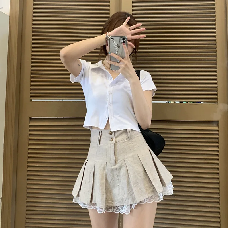 2022 New Korean Fashion Khaki Short Skirt Lace Cute Pleated Skirts for Women Preppy Style Button Up High Waist Summer Skirt