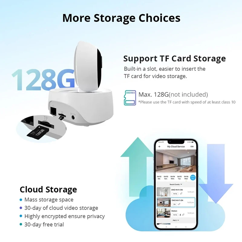 【Local и тучек для Storage】You может выбрать для того, чтобы сохранять и делиться видео с бесплатным приложением «30-дневная пробная версия облачного хранилища в Камера план или локально сохраненные с sd-картой (приобретается отдельно).