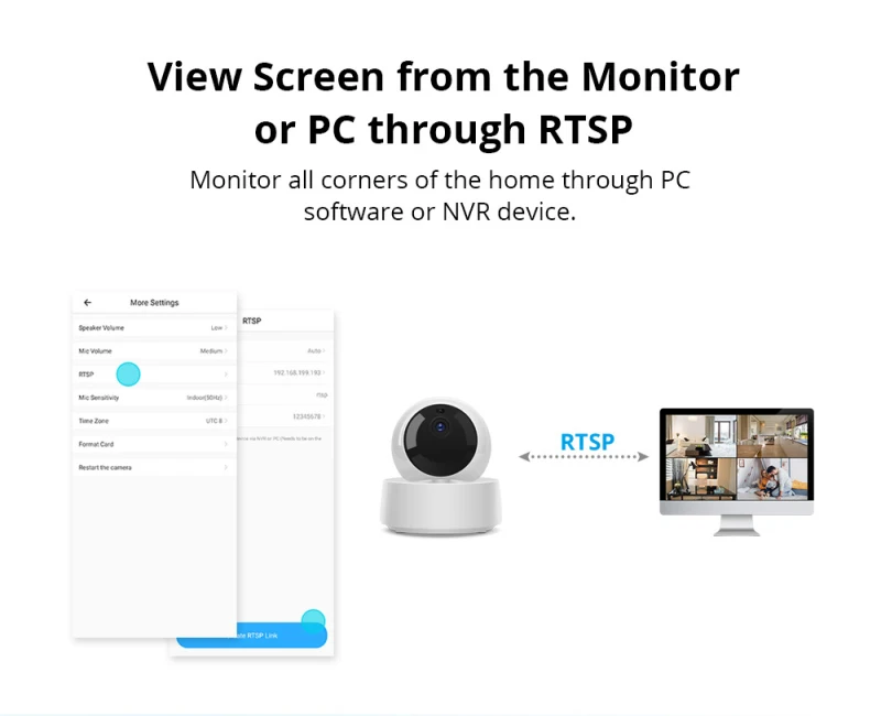 【Совместим с NVR devices】включите протокол RTSP в приложении для подключения устройств NVR и камеры.