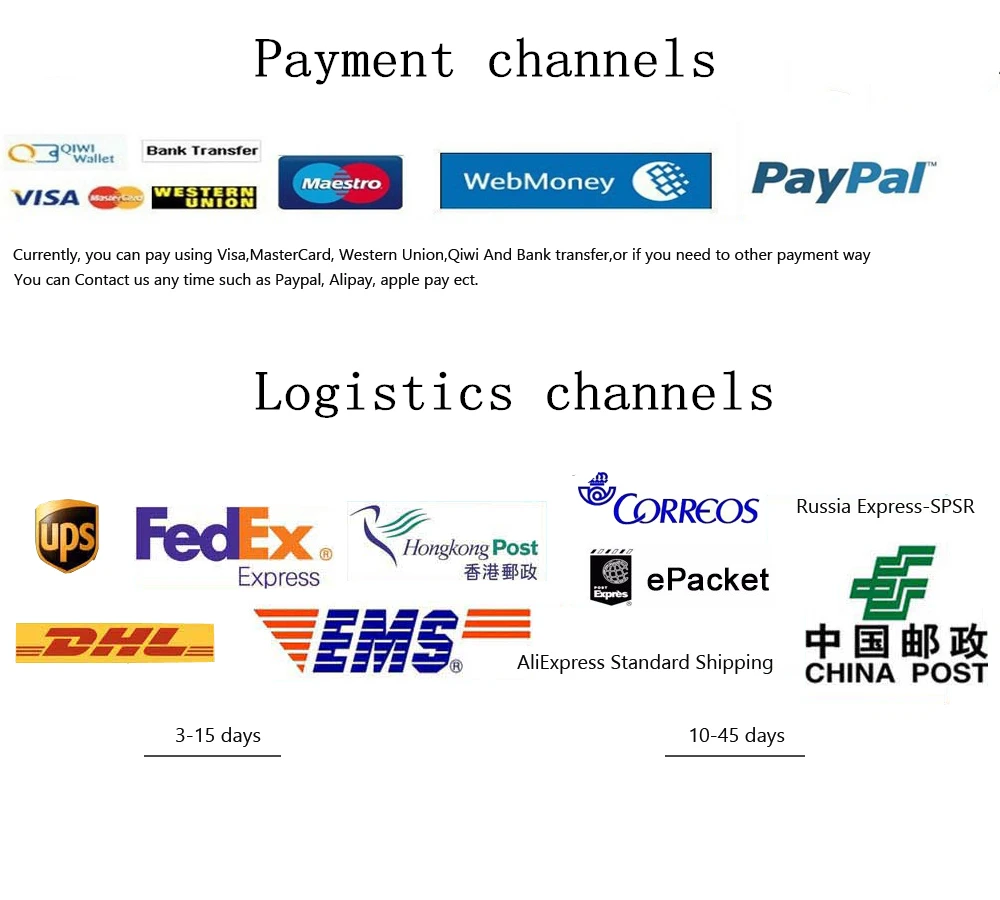 Способ оплаты 1. Существует множество способов оплаты на Aliexpress, таких как Alipay, кредитные карты, банковские переводы в реальном времени, офлайн-платежи (банковские переводы и Western Union). Вы можете выбрать наиболее удобный для Вас способ. Для защиты ваших интересов оплата будет временно задержана компанией Alibaba и не будет передана нам, пока вы не получите заказ и не подтвердите, что остались им довольны. Доставка 1. Когда мы получили информацию о вашем заказе и оплате, мы обычно 2-5 дней для завершения доставки, мы предоставляем информацию для отслеживания логистики. Однако из-за определенных факторов и региональных проблем, которые могут привести к задержке доставки, надеемся на понимание, время доставки обычно составляет 20-60 дней, пожалуйста, будьте терпеливы. 2. Если вам нужен более быстрый способ доставки, вы можете выбрать другие способы, пожалуйста, свяжитесь с нами. 3. Мы не несем ответственности за любые таможенные пошлины или налог на импорт. 4. Заказ будет отправлен в вашу руку транспортной компанией в течение срока доставки, соответствующего списку услуг доставки ниже. Если вы не получили посылка в течение срока доставки, пожалуйста, свяжитесь с нами, и мы ответим Вам в течение 24 часов. Политика Возврата 1. Мы полностью гарантируем наши товары. Все товары находятся в совершенно новом состоянии, если не указано иное в другом месте в описании. 2. Все возвраты-Бракованные или иные-должны быть предварительно разрешены. Пожалуйста, свяжитесь с нами, чтобы получить разрешение и обратный адрес, прежде чем отправить товар обратно. 3. Во всех случаях покупатели оплачивают стоимость доставки за свой счет, чтобы вернуть товары для обмена или возврата денег. Мы будем нести ответственность за почтовые расходы по замене. Свяжитесь с нами 1. Если у вас есть какие-либо вопросы, пожалуйста, свяжитесь с нами, мы ответим на ваши вопросы как можно скорее 2. Мы ответим на ваш вопрос по электронной почте, пожалуйста, проверьте ваш адрес электронной почты для получения ответов. Отзывы 1. Пожалуйста, напишите мне, прежде чем оставлять отзывы, Если вы недовольны своим товаром, чтобы мы могли его обработать. 2. Международные покупатели, пожалуйста, обратите внимание: импортные пошлины, налоги и сборы не включены в цену товара или стоимость доставки.