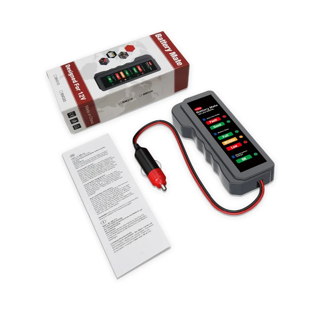 Почему стоит выбрать цифровой автомобильный тестер батареи BM310 / BM320 12V? Мы стремимся к изысканному мастерству и отличному качеству. 1. Отсутствие утечки, отсутствие тепла, безопасная работа.2. Работает без перерыва, полная защита, обратная защита.3. Быстрый и точный дисплей результатов тестирования батареи (всего 3 секунды).4. Он может быть обнаружен непосредственно в машине, не снимая аккумулятор.5. Это показывает состояние здоровья батареи.6. Тестирование сигнала на низких частотах не требует чрезмерной зарядки.7. Проверьте, является ли напряжение зарядки автомобиля нормальным.8. Определение исходного напряжения автомобиля.9. Определение состояния перегрузки автомобильного аккумулятора. Как использовать цифровой автомобильный тестер батареи BM310 / BM320 12V? До BM310: Подключите тестовые зажимы к положительному и отрицательному положению батареи, проверьте светодиодный дисплейЗнать состояние автомобильного аккумулятора.