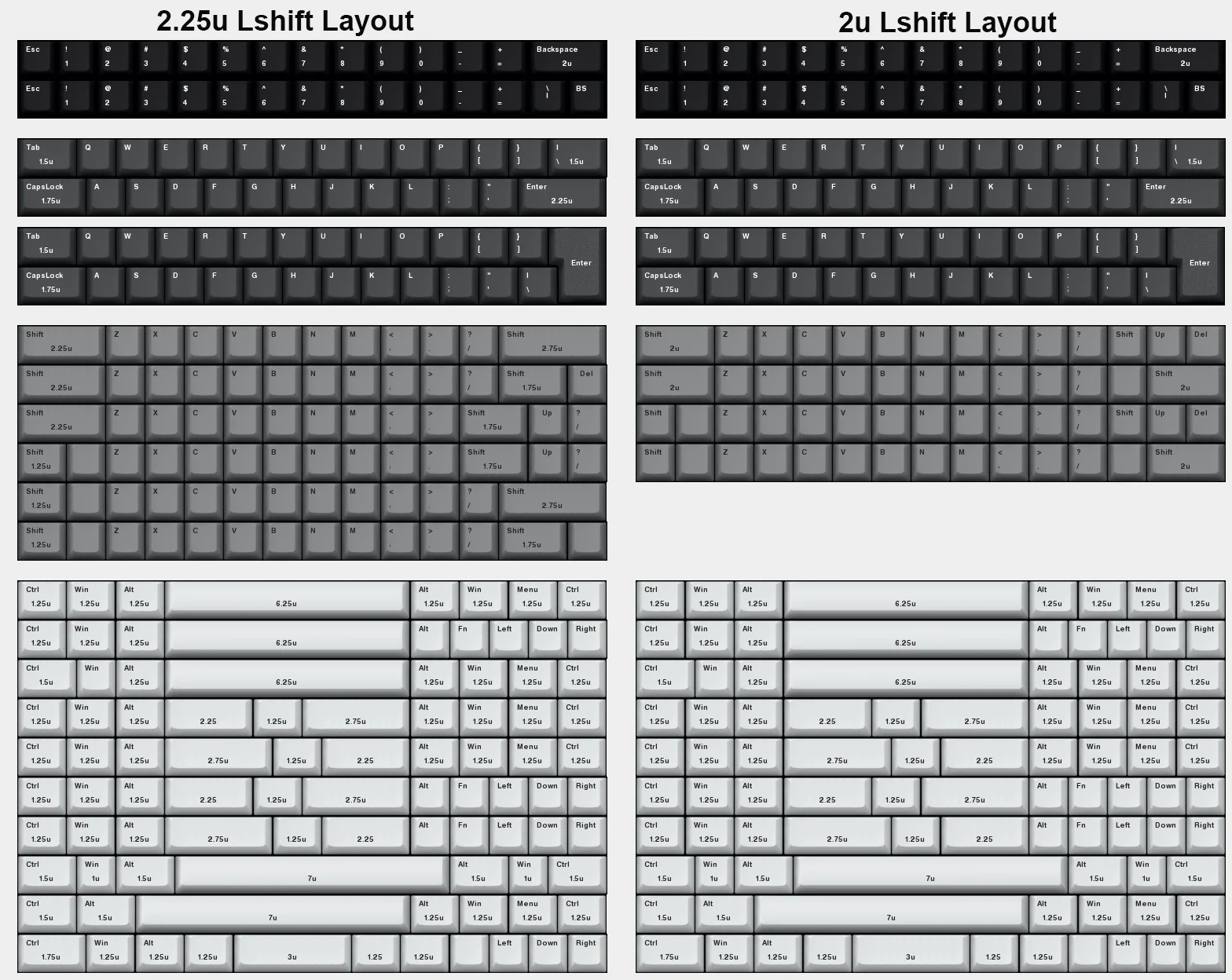 PCB is QMK gold Pad and Type C connector which is high quality.It supports all layout as below image shown.You can choose plate directly according to layout you want.